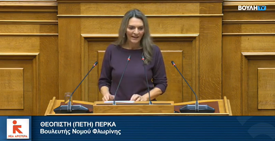 Για άλλη μια φορά, ως βουλεύτρια του νομού, ανέφερε στην Βουλή την περίπτωση της Φλώρινας, η οποία βιώνει τα αποτελέσματα της επικοινωνιακής πολιτικής της κυβέρνησης. Συγκεκριμένα, τόνισε «έχουμε παύση της λιγνιτικής παραγωγής στην Ελλάδα αλλά συνέχιση της εξόρυξης λιγνίτη από την Αχλάδα για διάθεση σε μονάδες ηλεκτροπαραγωγής στη Βόρεια Μακεδονία. Όπως έχουμε την απόφαση της κυβέρνησης να σταματήσει την τηλεθέρμανση στη Φλώρινα και να προωθήσει το ορυκτό αέριο για θέρμανση. Μία παράλογη, ακριβή αλλά και ανεφάρμοστη λύση, όπως αποδεικνύεται από το γεγονός ότι αρκετά νοικοκυριά δεν έχουν ακόμη και σήμερα πρόσβαση σε θέρμανση όταν, ο χειμώνας έχει μπει για τα καλά». Σε όλα τα παραπάνω, κοινή συνισταμένη είναι «η ενίσχυση του ρόλου και των υποδομών ορυκτού αερίου», πρόσθεσε η Πέτη Πέρκα, καθώς η κυβέρνηση εφαρμόζει τη «συνταγή» Τραμπ στην ενέργεια.