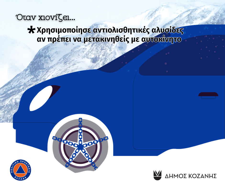 Η Πολιτική Προστασία του Δήμου Κοζάνης, συμβουλεύει τους πολίτες να είναι ιδιαίτερα προσεκτικοί και προετοιμασμένοι, ακολουθώντας πιστά τις οδηγίες της Γενικής Γραμματείας Πολιτικής Προστασίας του Υπουργείου Κλιματικής Κρίσης & Πολιτικής Προστασίας (https://civilprotection.gov.gr/) για τις χιονοπτώσεις.