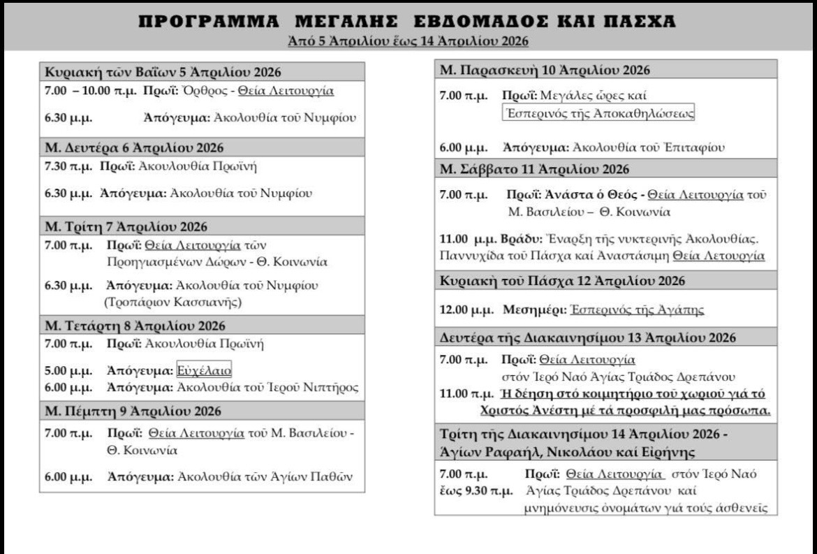 Πρόγραμμα Ακολουθιών και Μ.Εβδομάδας, Ιερού Ναού Αγίας Τριάδας Δρεπάνου