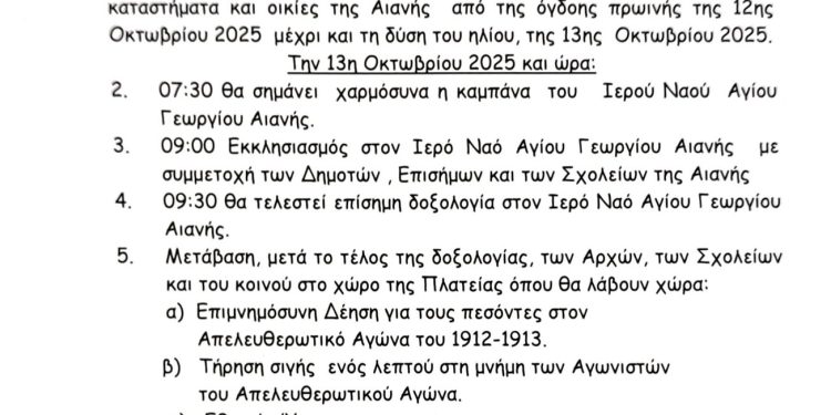 Πρόγραμμα εορτασμού για την 113η επέτειο της απελευθέρωσης της Αιανής από τον τουρκικό ζυγό