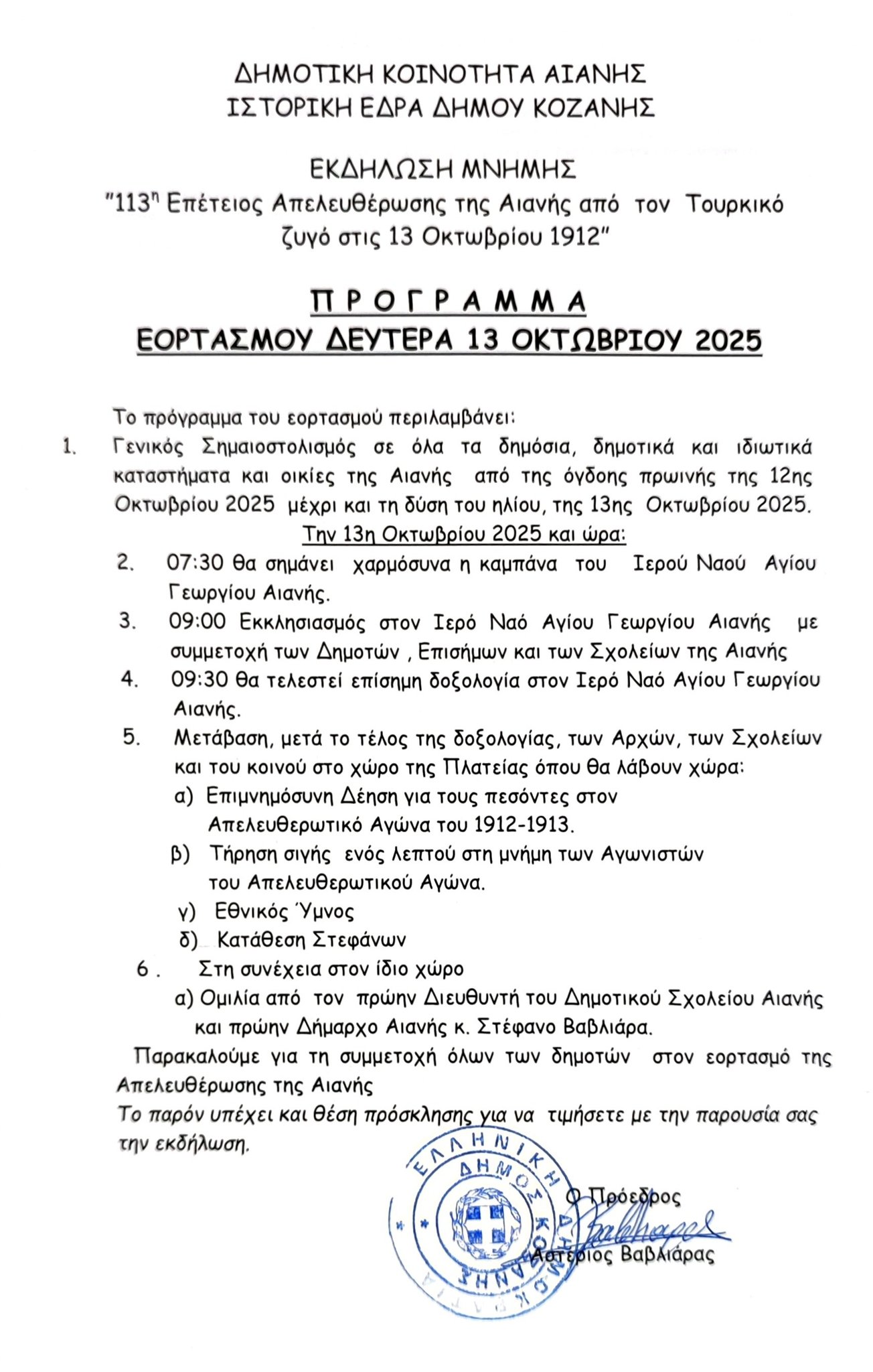 Παρακαλούμε για τη συμμετοχή όλων των δημοτών  στον εορτασμό της Απελευθέρωσης της Αιανής