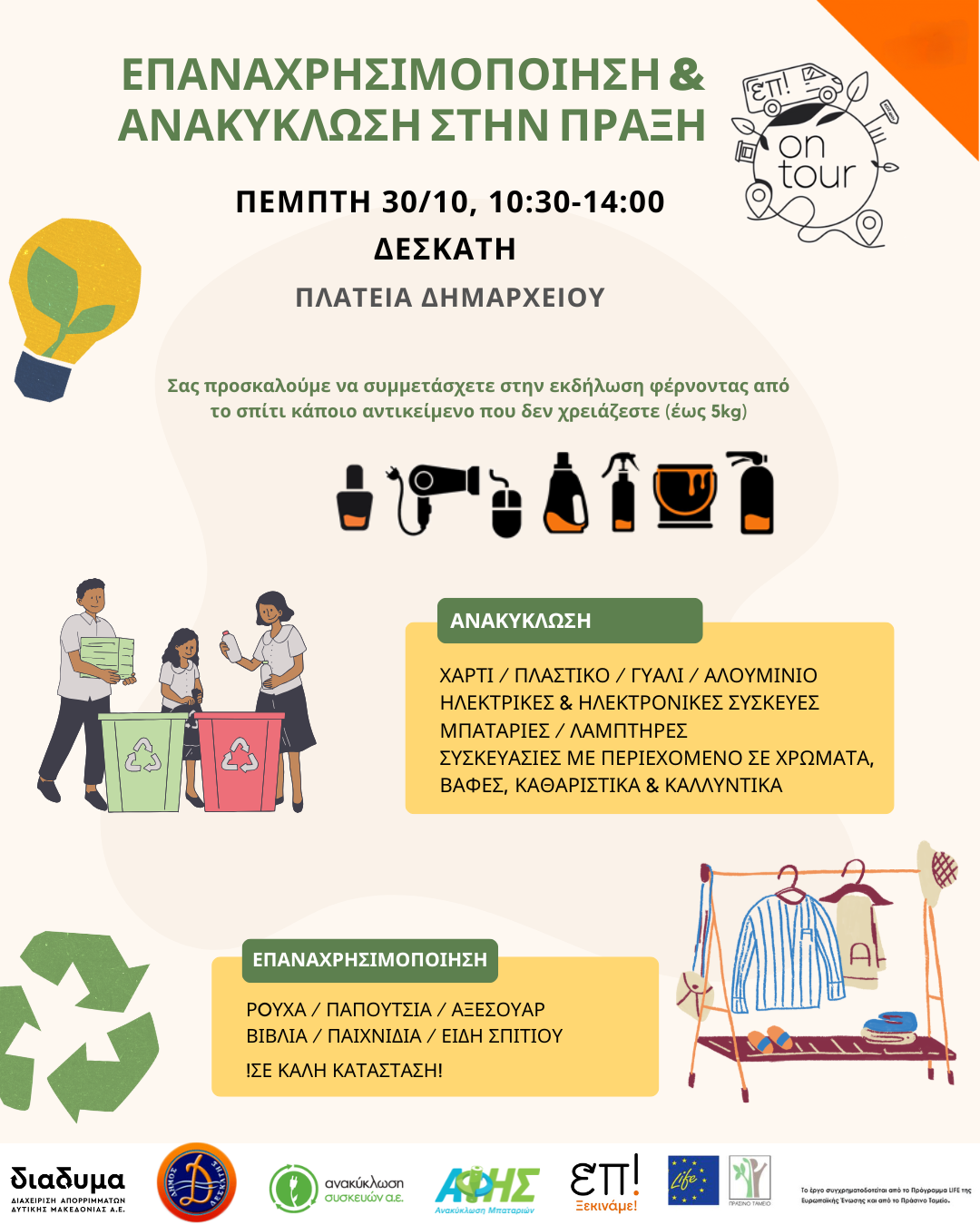 Η δράση υλοποιείται στο πλαίσιο του έργου LIFE-IP CEI-Greece – (LIFE18 IPE/GR/000013) για την εφαρμογή της Κυκλικής Οικονομίας στην Ελλάδα σε συνεργασία της ΔΙΑΔΥΜΑ ΑΕ με την Ανακύκλωση Συσκευών Α.Ε. και την ΑΦΗΣ Α.Ε.