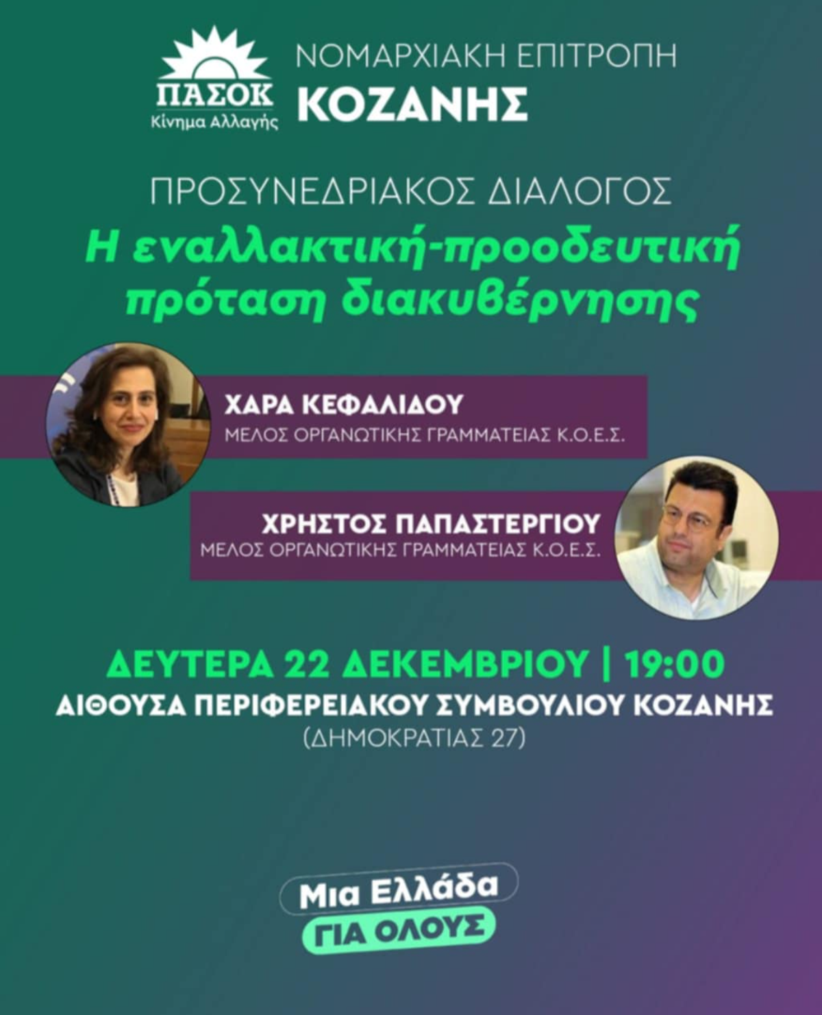 Η Νομαρχιακή Επιτροπή ΠΑ.ΣΟ.Κ. – Κινήματος Αλλαγής Κοζάνης προσκαλεί τα μέλη και τους φίλους του Κινήματος στην Ολομέλεια που διοργανώνει στο πλαίσιο του προσυνεδριακού διαλόγου, με θέμα: «Η εναλλακτική – προοδευτική πρόταση διακυβέρνησης». Εισηγητές της εκδήλωσης θα είναι η Χαρά Κεφαλίδου και ο Χρήστος Παπαστεργίου, μέλη της Οργανωτικής Γραμματείας Κ.Ο.Ε.Σ. Η Ολομέλεια θα πραγματοποιηθεί τη Δευτέρα 22 Δεκεμβρίου και ώρα 19:00, στην Αίθουσα Περιφερειακού Συμβουλίου Κοζάνης (Δημοκρατίας 27). Η παρουσία και η ενεργή συμμετοχή όλων είναι ιδιαίτερα σημαντική για την ενίσχυση του διαλόγου και τη συνδιαμόρφωση των πολιτικών θέσεων του ΠΑ.ΣΟ.Κ. – Κινήματος Αλλαγής, με στόχο μια Ελλάδα για όλους.