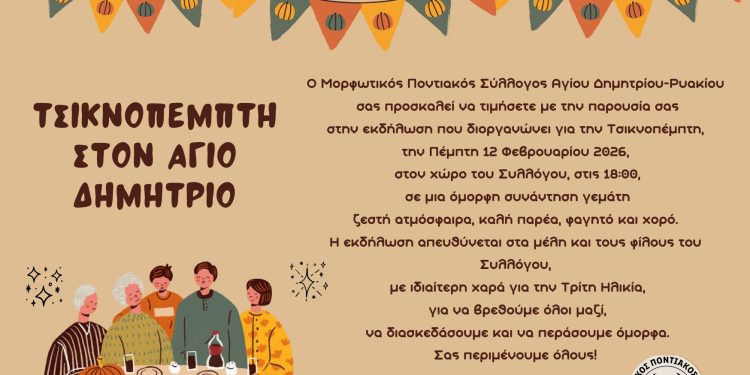 Ο Μορφωτικός Ποντιακός Σύλλογος Αγίου Δημητρίου-Ρυακίου διοργανώνει εκδήλωση για την Τσικνοπέμπτη, την Πέμπτη 12/02/2026, με ζωντανή μουσική και τη συμμετοχή καλλιτεχνών της περιοχής.