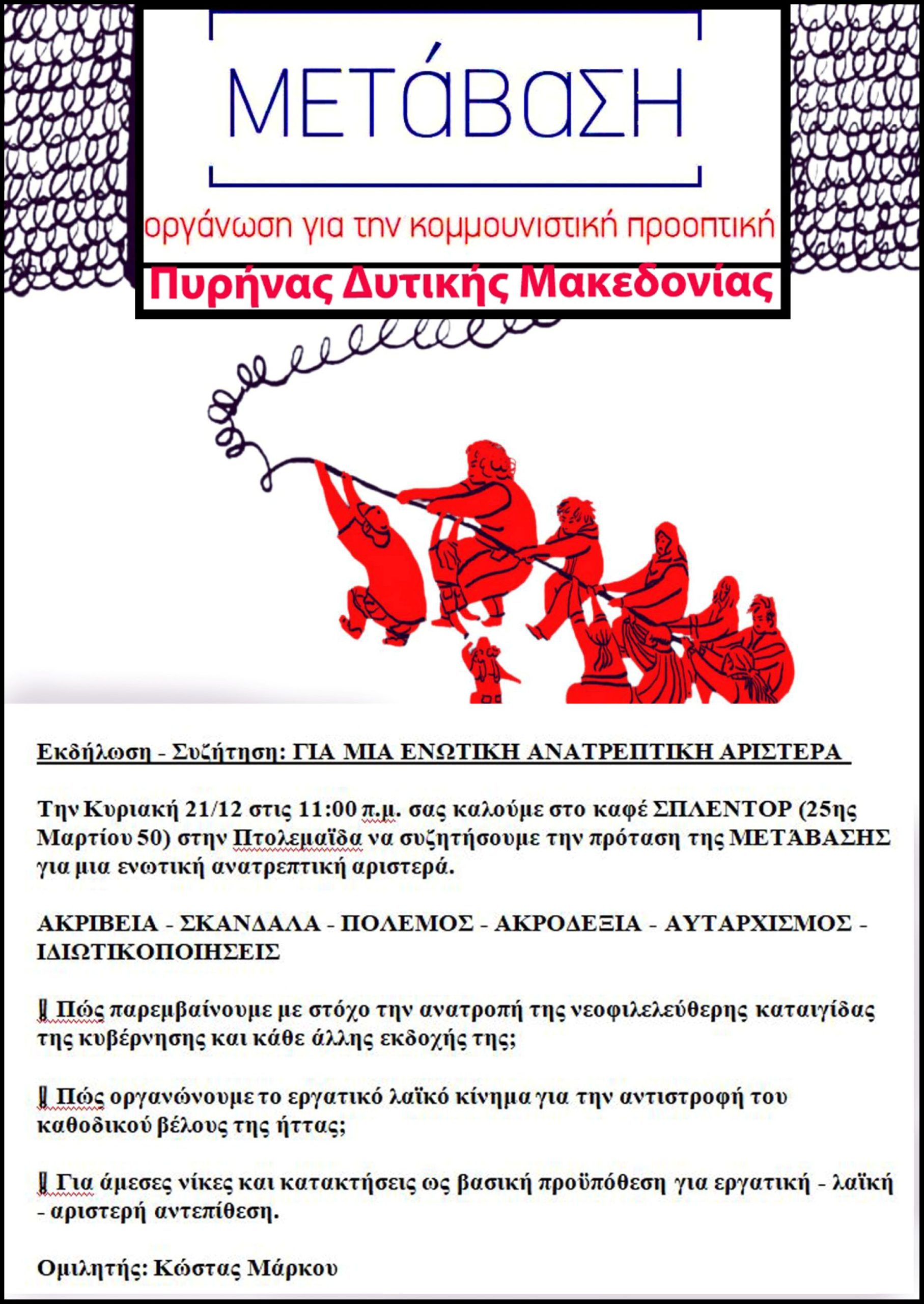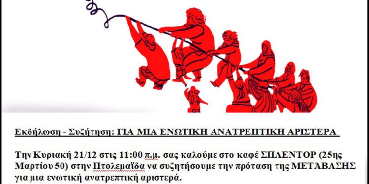 Την Κυριακή 21/12 στις 11:00 π.μ. σας καλούμε στο καφέ ΣΠΛΕΝΤΟΡ (25ης Μαρτίου 50) στην Πτολεμαϊδα να συζητήσουμε την πρόταση της ΜΕΤΆΒΑΣΗΣ για μια ενωτική ανατρεπτική αριστερά.