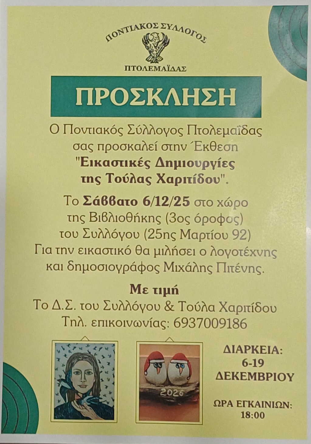 Σας προσκαλούμε στα εγκαίνια της έκθεσης ζωγραφικής της εικαστικού κας. Τούλας Χαριτίδου που θα πραγματοποιηθεί στην Αίθουσα Μνήμης-Βιβλιοθήκης στον 3ο όροφο του συλλόγου μας, το Σάββατο 6 Δεκεμβρίου 2025 και ώρα 18:00. Διάρκεια έκθεσης 6 έως 19 Δεκεμβρίου 2025.