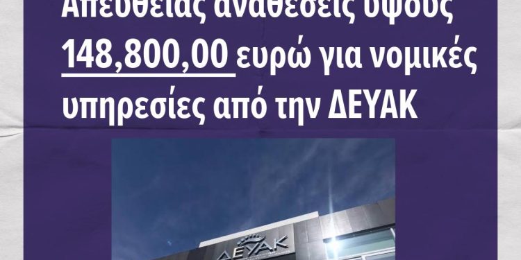 - Σχετικά με την εκπροσώπηση της ΔΕΥΑΚ σε διάφορες υποθέσεις και στο Συμβούλιο της Επικρατείας από το εν λόγω νομικό γραφείο, θα πρέπει να διευκρινιστεί ότι αυτό συνέβη εκτός των δυο συμβάσεων ύψους 148.800,00 ευρώ, γεγονός που εντέχνως παραλείπεται από την απάντηση της ΔΕΥΑΚ. Το συγκεκριμένο νομικό γραφείο έχει επίσης συμβάσεις ύψους 30.008,00 ευρώ τα έτη 2024-2025 με την ΔΕΥΑΚ για παραστάσεις σε δικαστήρια. Επομένως συνολικά το ποσό που έχει συμβατοποιηθεί μέχρι σήμερα μεταξύ της ΔΕΥΑΚ και της συγκεκριμένης νομικής εταιρίας είναι ποσού 178.808,00 ευρώ με απευθείας αναθέσεις.