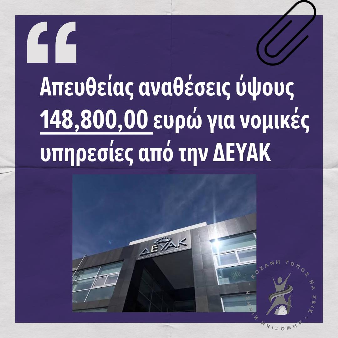 Συμπερασματικά παραμένει χωρίς καμία εξήγηση το γεγονός ότι η ΔΕΥΑΚ επέλεξε έναν αδιαφανή τρόπο για να αναθέσει αναγκαίες ή μη, νομικές υπηρεσίες ύψους 178.808,00 σε νομικό γραφείο της Αθήνας στα όρια της νομιμότητας, χωρίς όμως καμία ηθική νομιμοποίηση, διαφάνεια, δικαιοσύνη και σωστή διαχείριση δημόσιου χρήματος και σε αυτό έχει ευθύνη τόσο ο Πρόεδρος της ΔΕΥΑΚ Π. Ματιάκης όσο και ο Δήμαρχος Κοζάνης Γ. Κοκκαλιαρης.
