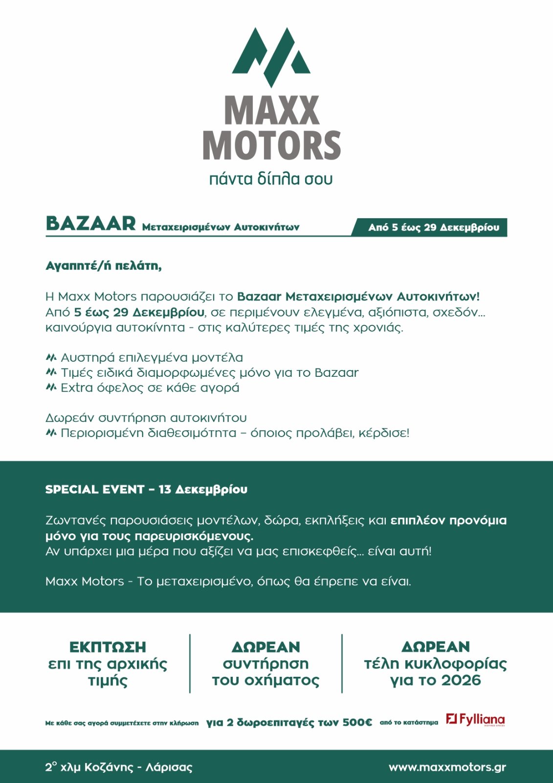 Η Maxx Motors ανακοινώνει με χαρά τη διοργάνωση ενός μοναδικού Bazaar _Special Event που θα πραγματοποιηθεί το Σάββατο 13 Δεκεμβρίου στις σύγχρονες εγκαταστάσεις της. Πρόκειται για μια γιορτινή εκδήλωση με πλούσιο πρόγραμμα, ειδικές προσφορές, εκπλήξεις και δώρα για όλους τους επισκέπτες.