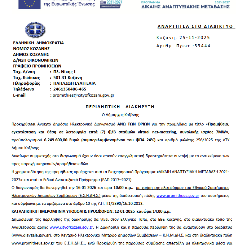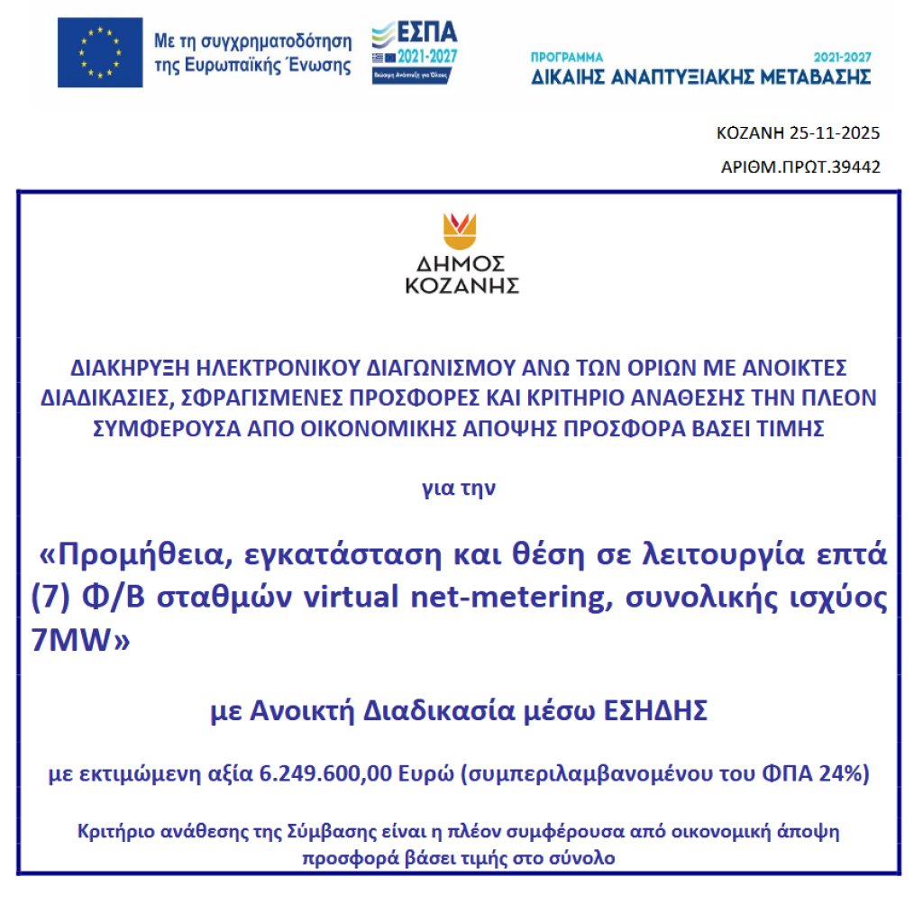 Ειδικότερα, το έργο με τίτλο «Προμήθεια, εγκατάσταση και θέση σε λειτουργία επτά (7) Φ/Β σταθμών virtual net-metering, συνολικής ισχύος 7MW», προϋπολογισμού 6.249.600,00 Ευρώ (συμπεριλαμβανομένου του ΦΠΑ 24%) και αριθμό μελέτης 256/2025 της ΔΤΥ Δήμου Κοζάνης, βρίσκεται ήδη σε ανοιχτό δημόσιο ηλεκτρονικό διαγωνισμό, τον οποίο προκήρυξε ο Δήμαρχος Κοζάνης Γιάννης Κοκκαλιάρης. Σύμφωνα με την προκήρυξη, ο διαγωνισμός για την ανάδειξη αναδόχου θα γίνει την Παρασκευή 16 Ιανουαρίου 2026 ενώ καταληκτική ημερομηνία υποβολής των προσφορών είναι η Δευτέρα 12 Ιανουαρίου 2026 και ώρα 14:00 το μεσημέρι. Η χρηματοδότηση του έργου προέρχεται από το Επιχειρησιακό Πρόγραμμα «ΔΙΚΑΙΗ ΑΝΑΠΤΥΞΙΑΚΗ ΜΕΤΑΒΑΣΗ 2021-2027» και από το Ειδικό Αναπτυξιακό Πρόγραμμα (ΕΑΠ 2017-2021), με φορέα υλοποίησης τον Δήμο Κοζάνης.