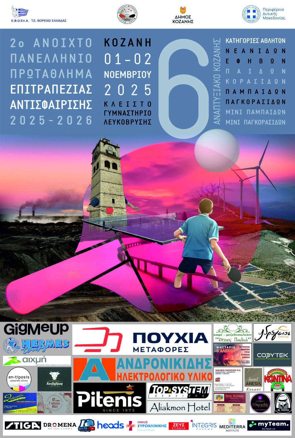 Στην Κοζάνη θα διεξαχθεί το δεύτερο από τα έξι Πανελλήνια Ανοιχτά Αναπτυξιακά Πρωταθλήματα Επιτραπέζιας Αντισφαίρισης για την αγωνιστική χρονιά 2025-26. Μετά τις πέντε προηγούμενες επιτυχημένες διοργανώσεις (2017, 2018, 2019, 2021, 2024) η ομοσπονδία Ε.Φ.Ο.ΕΠ.Α. του ολυμπιακού αθλήματος της Επιτραπέζιας Αντισφαίρισης, αποφάσισε να αναθέσει για 6η φορά τη διοργάνωση στον Σ.Ε.Α. ΚΟΖΑΝΗΣ.