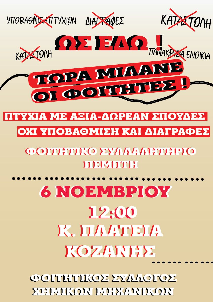 Γι’ αυτούς τους λόγους οι Φοιτητικοί Σύλλογοι που συνυπογράφουμε το κοινό αυτό ψήφισμα παίρνουμε την πρωτοβουλία να οργανώσουμε σειρά αγωνιστικών κινητοποιήσεων, κλιμακώνοντας με συλλαλητήρια την Πέμπτη 6 Νοέμβρη σε όλες τις πόλεις της χώρας, μαζί με τους μαθητές!».