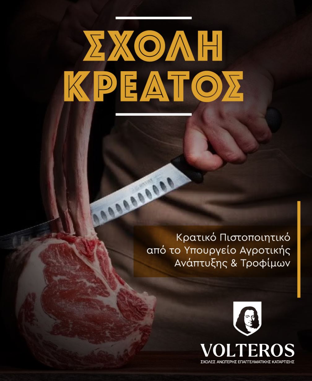 Κάνε επάγγελμα τη γνώση γύρω από το κρέας. Στις Ανώτερες Σχολές VOLTEROS προσφέρουμε ένα ταχύρρυθμο, απολύτως πρακτικό πρόγραμμα που οδηγεί στην απόκτηση άδειας άσκησης επαγγέλματος κρεοπώλη ή/και στην έναρξη δικής σου επιχείρησης.