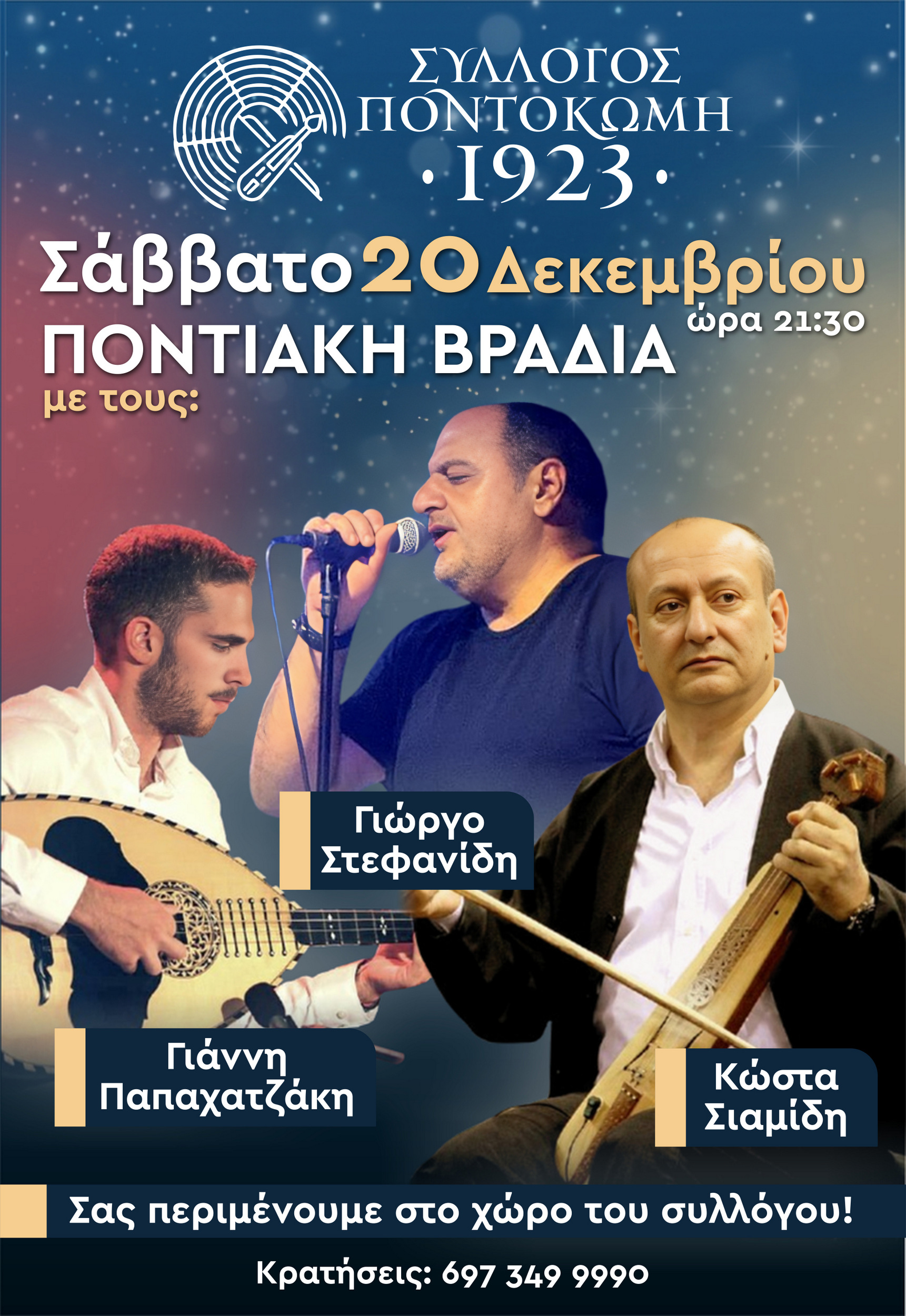 Σύλλογος «Ποντοκώμη 1923» – Σάββατο 20 Δεκεμβρίου Ποντιακή βραδιά με τονΓιώργο Στεφανίδη, τον Κώστα Σιαμίδη και τον Γιάννη Παπαχατζάκη