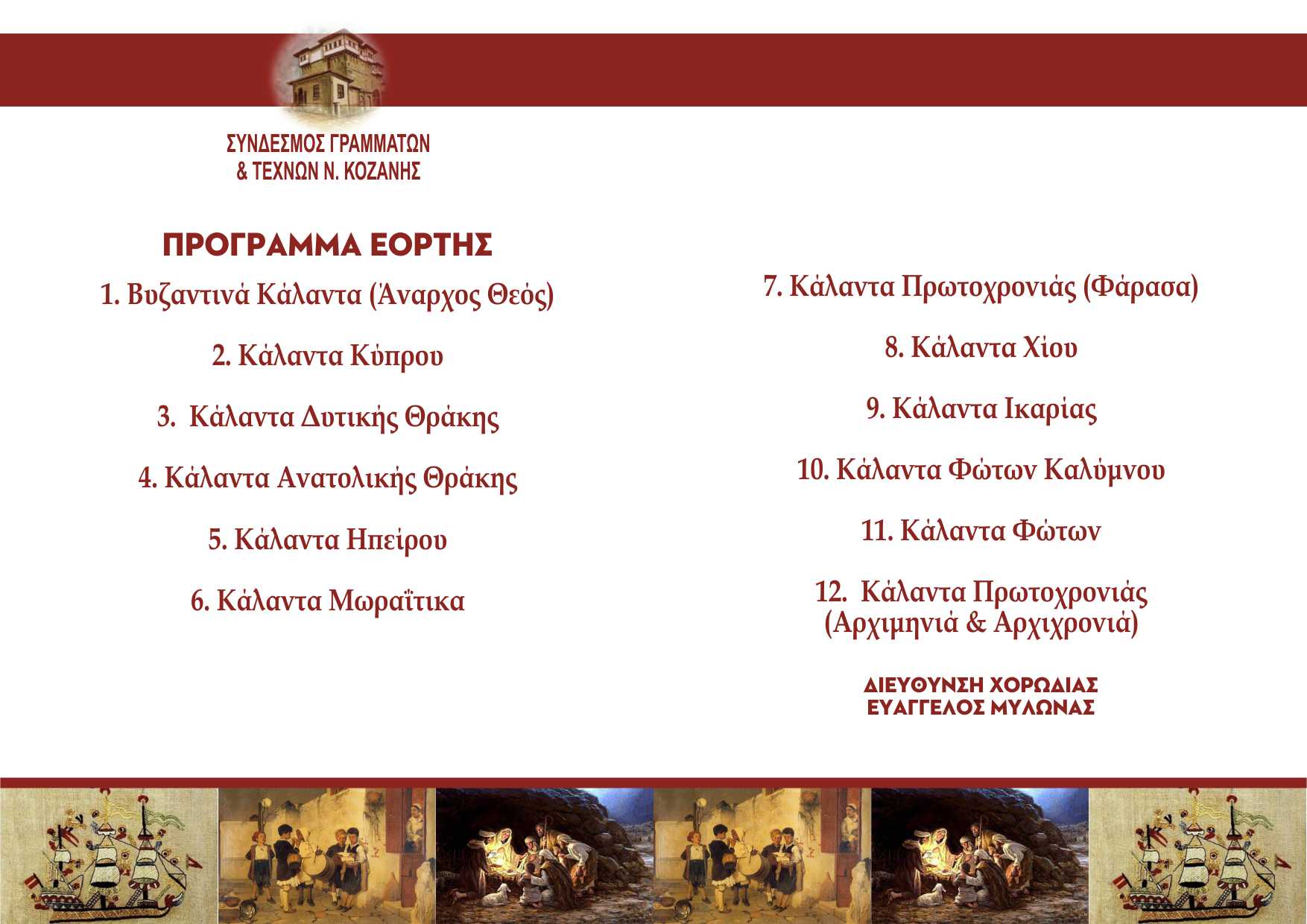 Τα μέλη της παραδοσιακής χορωδίας καθοδηγούμενα από τον χοράρχη τους κο Ευάγγελο Μυλωνά, υπό του ήχους παραδοσιακών οργάνων και την συμμετοχή άξιων συνεργατών παρουσιάζουν το Σάββατο 20 Δεκεμβρίου, στο Λαογραφικό μουσείο, κάλαντα από όλη την Ελλάδα, αναγγέλλοντας το θαυμαστό γεγονός της ενανθρωπίσεως του Κυρίου.