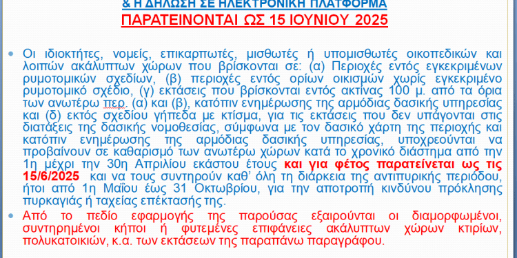 Οι ιδιοκτήτες, νομείς, επικαρπωτές, μισθωτές ή υπομισθωτές οικοπεδικών και λοιπών ακάλυπτων χώρων που βρίσκονται σε: (α) Περιοχές εντός εγκεκριμένων ρυμοτομικών σχεδίων, (β) περιοχές εντός ορίων οικισμών χωρίς εγκεκριμένο ρυμοτομικό σχέδιο, (γ) εκτάσεις που βρίσκονται εντός ακτίνας 100 μ. από τα όρια των ανωτέρω περ. (α) και (β), κατόπιν ενημέρωσης της αρμόδιας δασικής υπηρεσίας και (δ) εκτός σχεδίου γήπεδα με κτίσμα, για τις εκτάσεις που δεν υπάγονται στις διατάξεις της δασικής νομοθεσίας, σύμφωνα με τον δασικό χάρτη της περιοχής και κατόπιν ενημέρωσης της αρμόδιας δασικής υπηρεσίας, υποχρεούνται να προβαίνουν σε καθαρισμό των ανωτέρω χώρων κατά το χρονικό διάστημα από την 1η μέχρι την 30η Απριλίου εκάστου έτους και για φέτος παρατείνεται ως τις 15/6/2025 και να τους συντηρούν καθ’ όλη τη διάρκεια της αντιπυρικής περιόδου, ήτοι από 1η Μαΐου έως 31 Οκτωβρίου, για την αποτροπή κινδύνου πρόκλησης πυρκαγιάς ή ταχείας επέκτασής της.