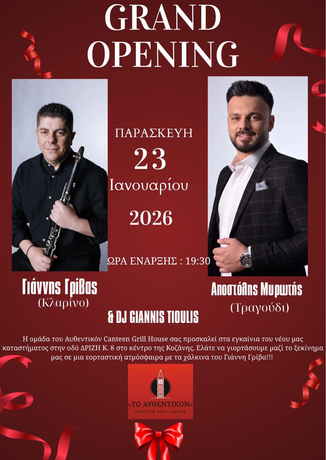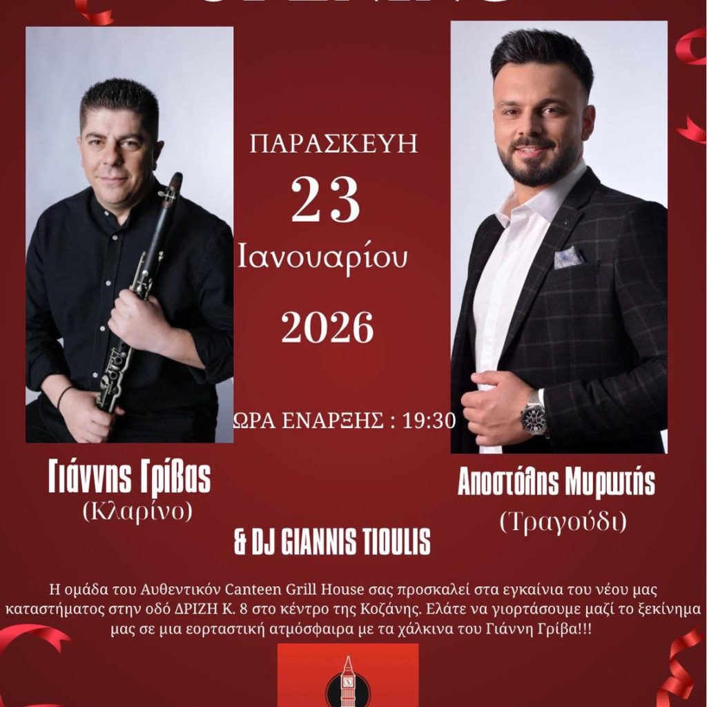 Σας περιμένουμε στα εγκαίνια μας 23 Ιανουαρίου 2026 εδώ στο Αυθεντικόν Canteen Grill House Δριζη Κ. 8 στο κέντρο της Κοζάνης με πολύ κέφι και χορό!!!