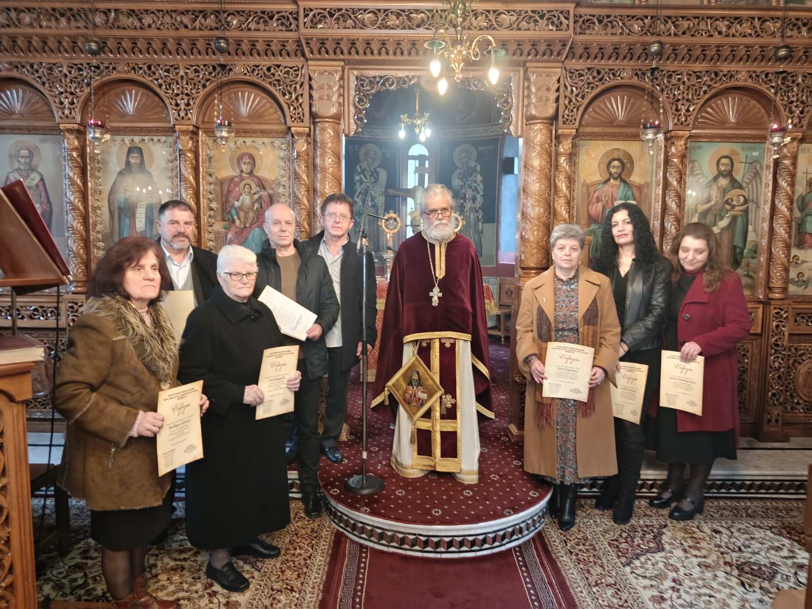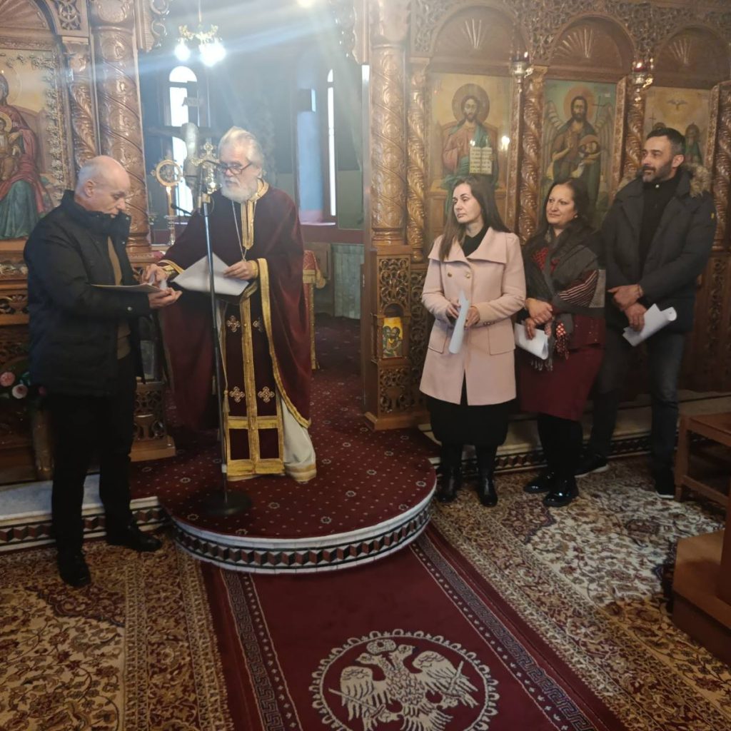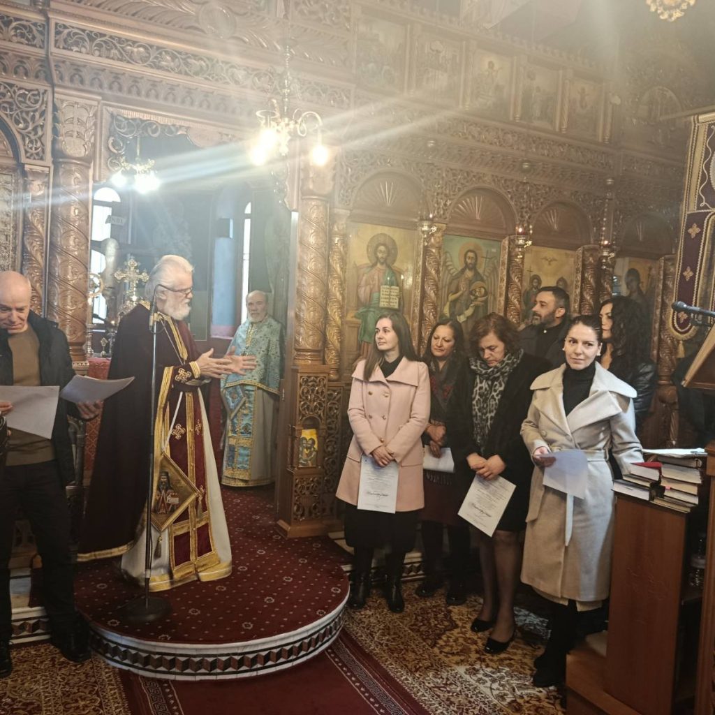 Συγχάρηκε τους απερχόμενους από το Εκκλ. Συμβούλιο (Άννα Κρομμύδα, Περικλή Παπαγεωργίου, Δημήτριο Στεφάνου) και από το Φιλόπτωχο (Άννα Γεωργάκη, Άννα Παπαδημητρίου) εξήρε την αφοσίωσή τους και την αγάπη τους στην Εκκλησία και στον Άγιο, με την πολυετή και ολοκάρδια διακονία, καλοσύνη και συνεργατικότητά τους, με το χαρούμενο και ανοιχτό πρόσωπο στο συνάνθρωπο, το σεβασμό τους στον Εφημέριο και στον Επίσκοπο-Μητροπολίτη, την άοκνη εξυπηρέτηση των πιστών, επέδωσε “Ευλογία” στον καθένα (σαν πτυχίο) και στη συνέχεια παρουσίασε στο εκκλησίασμα τα νέα μέλη του Εκκλ. Συμβουλίου και του Φιλόπτωχου. Συγχάρηκε τη νεωκόρο Θεοδώρα Δελνιώτη.