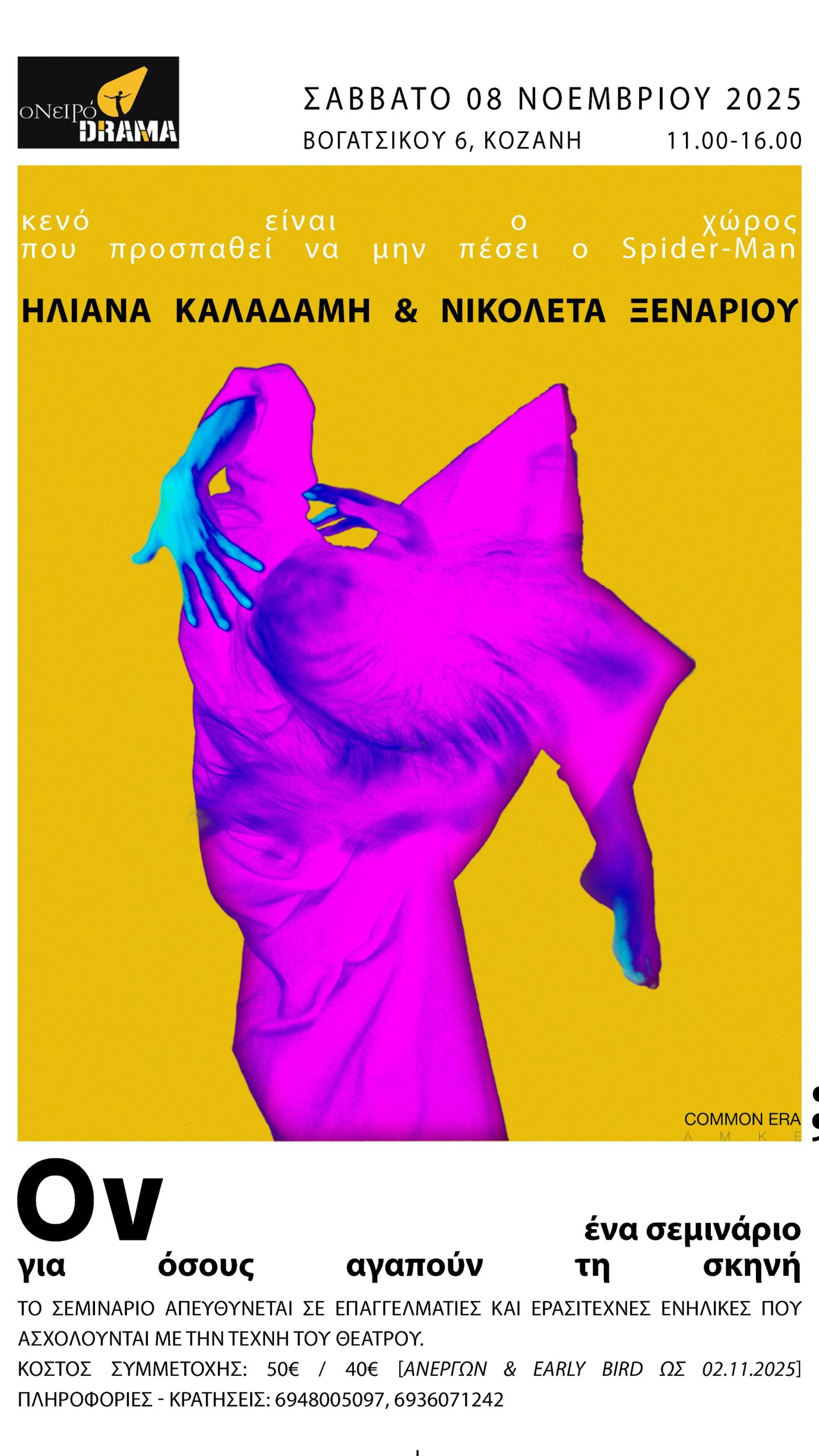 Η Ηλιάνα Καλαδάμη και η Νικολέτα Ξεναρίου με αφορμή την παράστασή τους ‘Ον’ διοργανώνουν ένα σεμινάριο για επί σκηνής όντα. Σε μία συνάντηση 5 ωρών, σκηνοθέτις και χορογράφος θα μοιραστούν τον προσωπικό τρόπο δουλειάς τους σ΄ ένα συμπυκνωμένο σεμινάριο, όπου θα δώσουν εργαλεία που δυναμώνουν την παρουσία μας στη σκηνή. Μέσα από παιχνίδια, συγκεκριμένες ασκήσεις, κινητικούς αυτοσχεδιασμούς και πειραματισμούς με το λόγο, θα οδηγηθούμε σε δοκιμές ψάχνοντας τρόπους να δημιουργούμε παρέα.