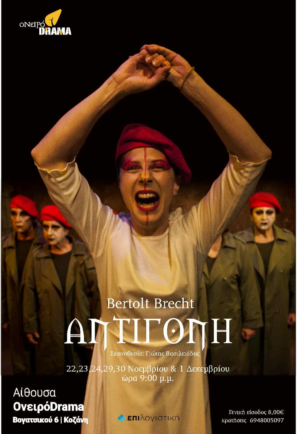 Το Ονειρόdrama παρουσιάζει την Αντιγόνη του Μπέρτολτ Μπρεχτ σε διασκευή και σκηνοθεσία του Γιώτη Βασιλειάδη. Ένα έργο πάντα επίκαιρο που αποτυπώνει τη σύγκρουση της εξουσίας με την ατομική ηθική, την αγάπη που μπορεί να φτάσει μέχρι τον θάνατο, την επικίνδυνη δύναμη της αρχής και την πτώση της, από μια θεατρική ομάδα που δε σταματά να μας εκπλήσσει με την αρτιότητα των έργων της και τον επαγγελματισμό της.