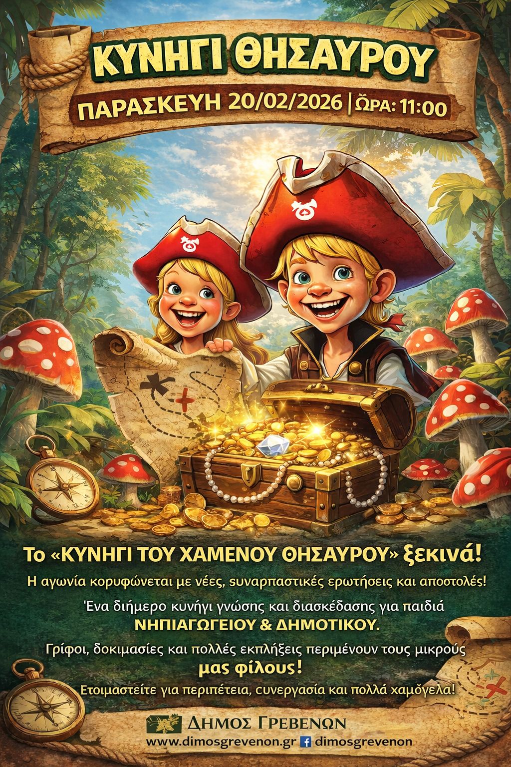 Το Κυνήγι του Χαμένου Θησαυρού μετατρέπει τις πλατείες και τα σημεία αναφοράς των Γρεβενών σε έναν μεγάλο διαδραστικό χάρτη περιπέτειας, όπου η γνώση, η παρατηρητικότητα και η συνεργασία οδηγούν στη νίκη. Με σύγχρονα μέσα τεχνολογίας και με οδηγό τη χαρά του παιχνιδιού, οι μαθητές των Νηπιαγωγείων και Δημοτικών Σχολείων ενώνουν τις δυνάμεις τους για να χαρίσουν στο σχολείο τους πολύτιμους βαθμούς!