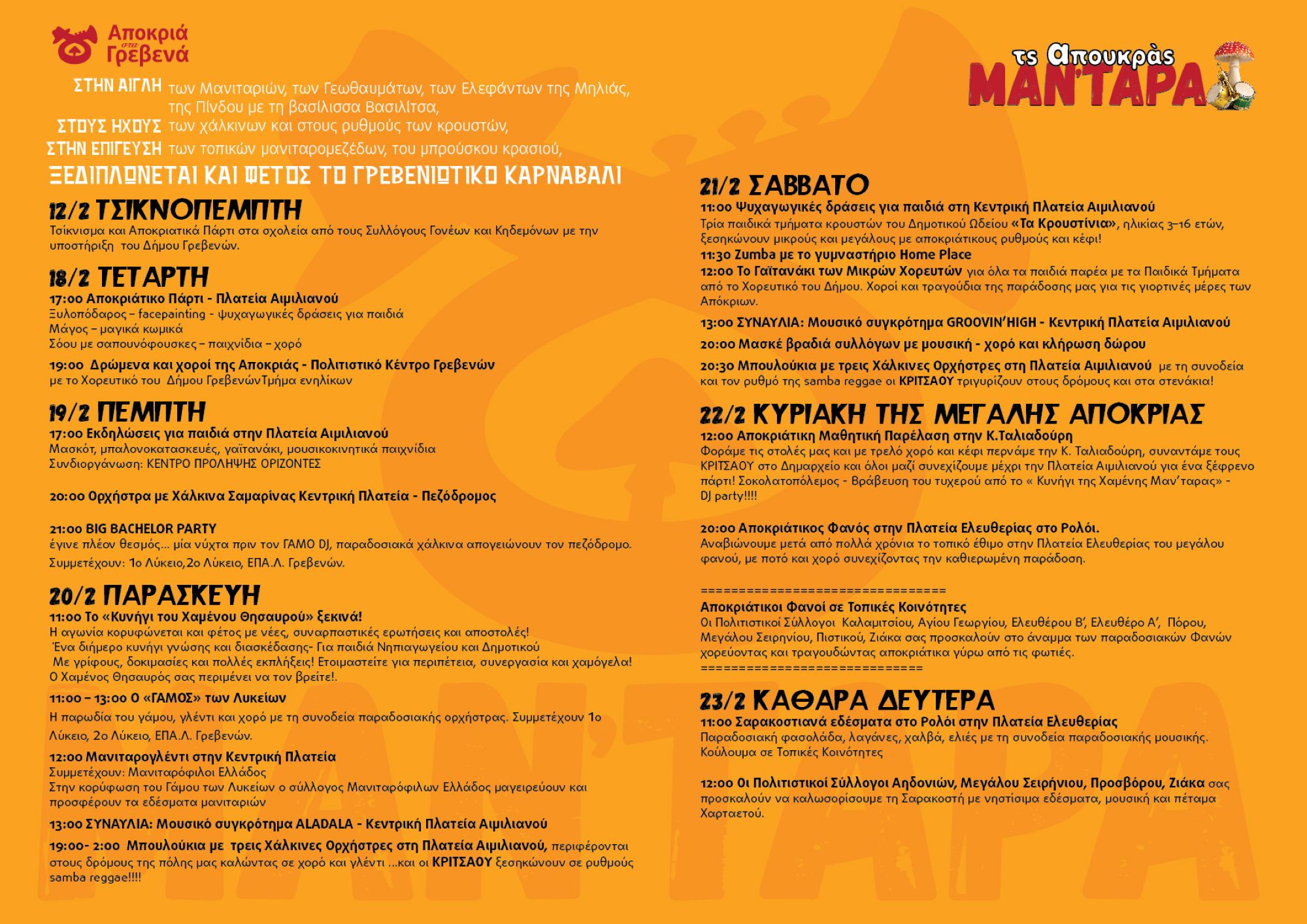 Στο πλαίσιο των Αποκριάτικων Εκδηλώσεων του Δήμου και της Περιφερειακής Ενότητας Γρεβενών με την ονομασία «Τσ’ Απουκράς ΜανΤάρα», οι μικροί μας φίλοι καλούνται να γίνουν εξερευνητές, να ανακαλύψουν κρυμμένους γρίφους και να ξεκλειδώσουν μυστικά που κρύβονται σε κάθε γωνιά της πόλης.