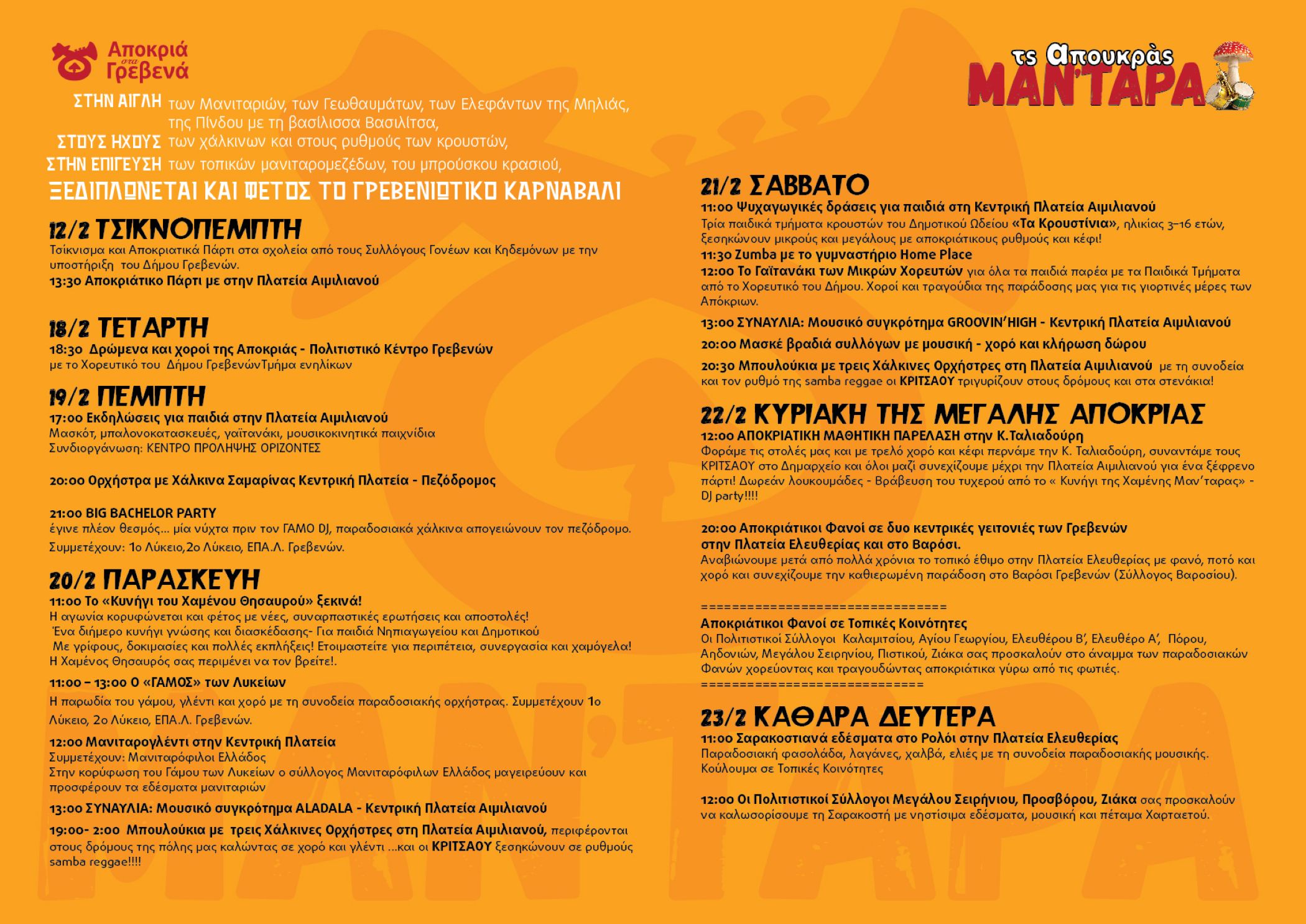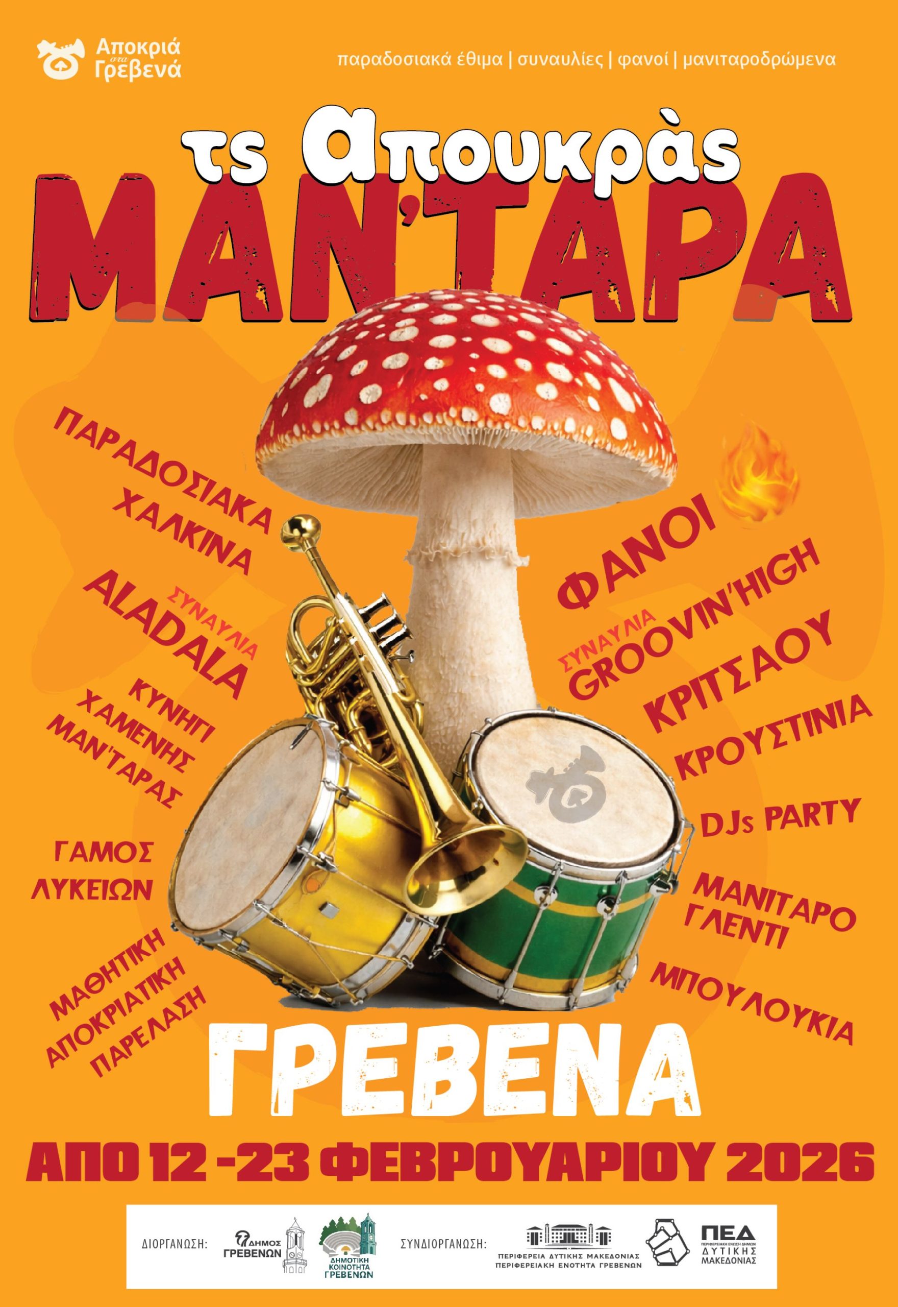 Στα Γρεβενά των μανιταριών και των γεύσεων, των χάλκινων και των κρουστών, της παράδοσης που αντηχεί στις πλατείες και στα σοκάκια και του κεφιού που ενώνει μικρούς και μεγάλους, ξεδιπλώνεται και φέτος το Γρεβενιώτικο Καρναβάλι «ΤΣ΄ ΑΠΟΥΚΡΑΣ ΜΑΝ’ΤΑΡΑ»!!!