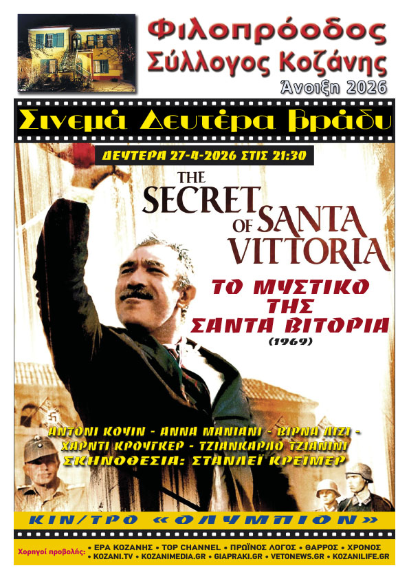 Ο Φιλοπρόοδος Σύλλογος Κοζάνης παρουσιάζει, αυτή τη Δευτέρα 27 Απριλίου 2026 στην επάνω αίθουσα του κινηματοθέατρου «Ολύμπιον», στις 9:30 το βράδυ, την τελευταία ταινία της χειμερινής περιόδου. Πρόκειται για την αριστουργηματική και δυσεύρετη κωμωδία του Στάνλεϊ Κρέιμερ, «Το Μυστικό της Σάντα Βιτόρια» (The Secret of Santa Vittoria – 1969), βασισμένη στο ομώνυμο best–seller βιβλίο του Ρόμπερτ Κράιτον, που κέρδισε τις Χρυσές Σφαίρες Καλύτερης Ταινίας το 1970 και προτάθηκε για 2 Οσκαρ.