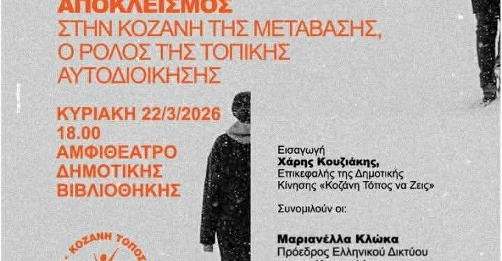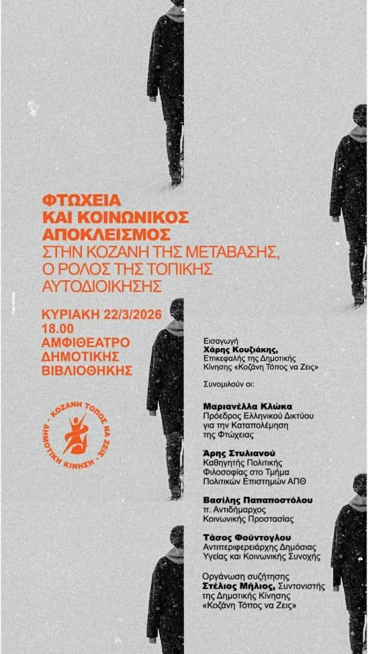 Η Δημοτική Κίνηση «Κοζάνη Τόπος να Ζεις» σας προσκαλεί την Κυριακή 22 Μαρτίου στις 18:00, στο Αμφιθέατρο της Δημοτικής Βιβλιοθήκης Κοζάνης στην ανοιχτή εκδήλωση με τίτλο: «Φτώχεια και κοινωνικός αποκλεισμός στην Κοζάνη της Μετάβασης, ο ρόλος της Τοπικής Αυτοδιοίκησης».