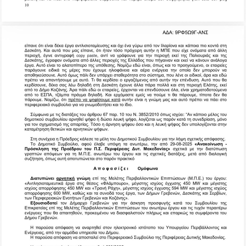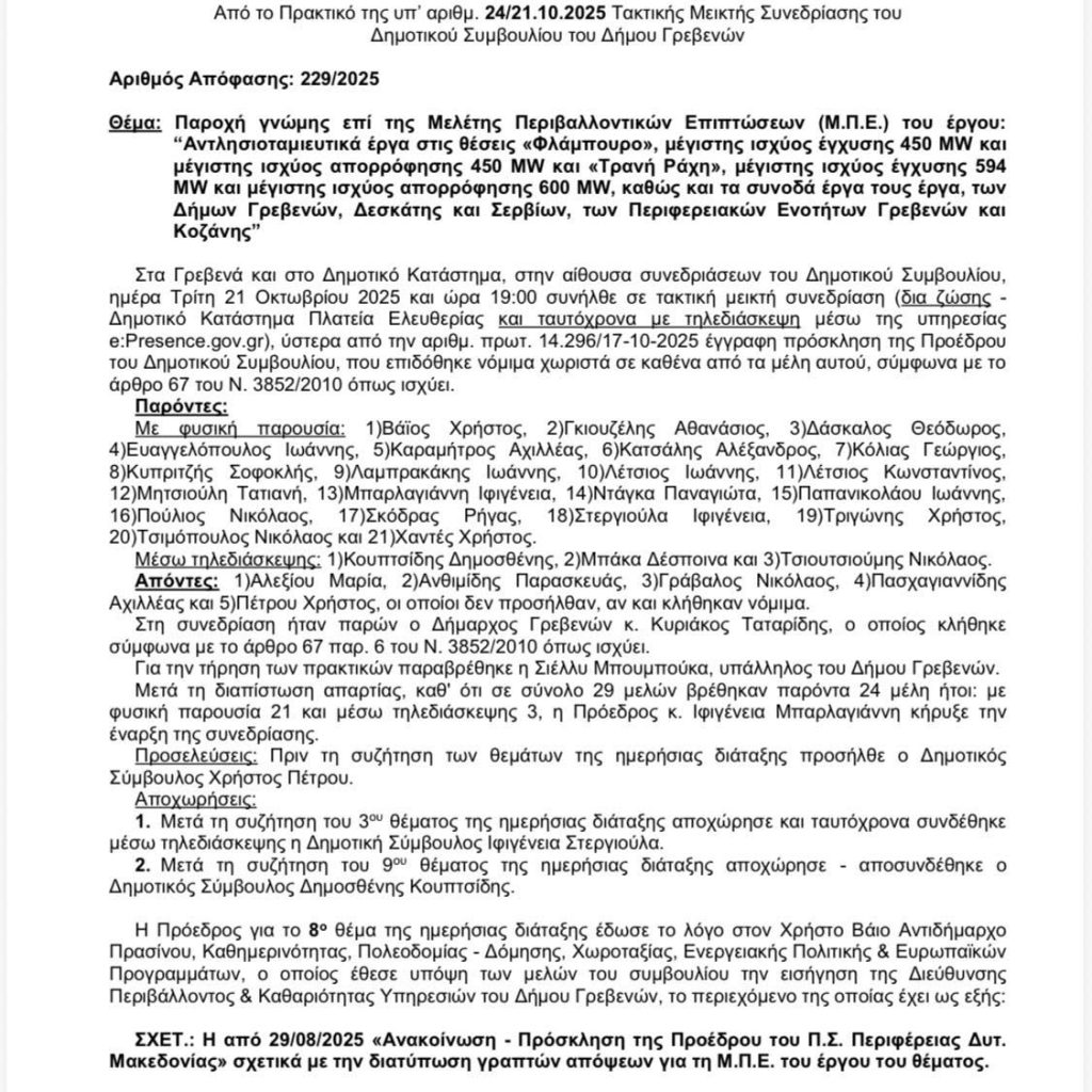 Το δημοτικό συμβούλιο Γρεβενών με την υπ’ αριθμ. 229/2025 απόφαση του, γνωμοδότησε ΟΜΟΦΩΝΑ ΑΡΝΗΤΙΚΑ για τη μελέτη περιβαλλοντικών επιπτώσεων του έργου αντλησιοταμίευσης στις θέσεις «ΦΛΑΜΠΟΥΡΟ» και «ΤΡΑΝΗ ΡΑΧΗ».