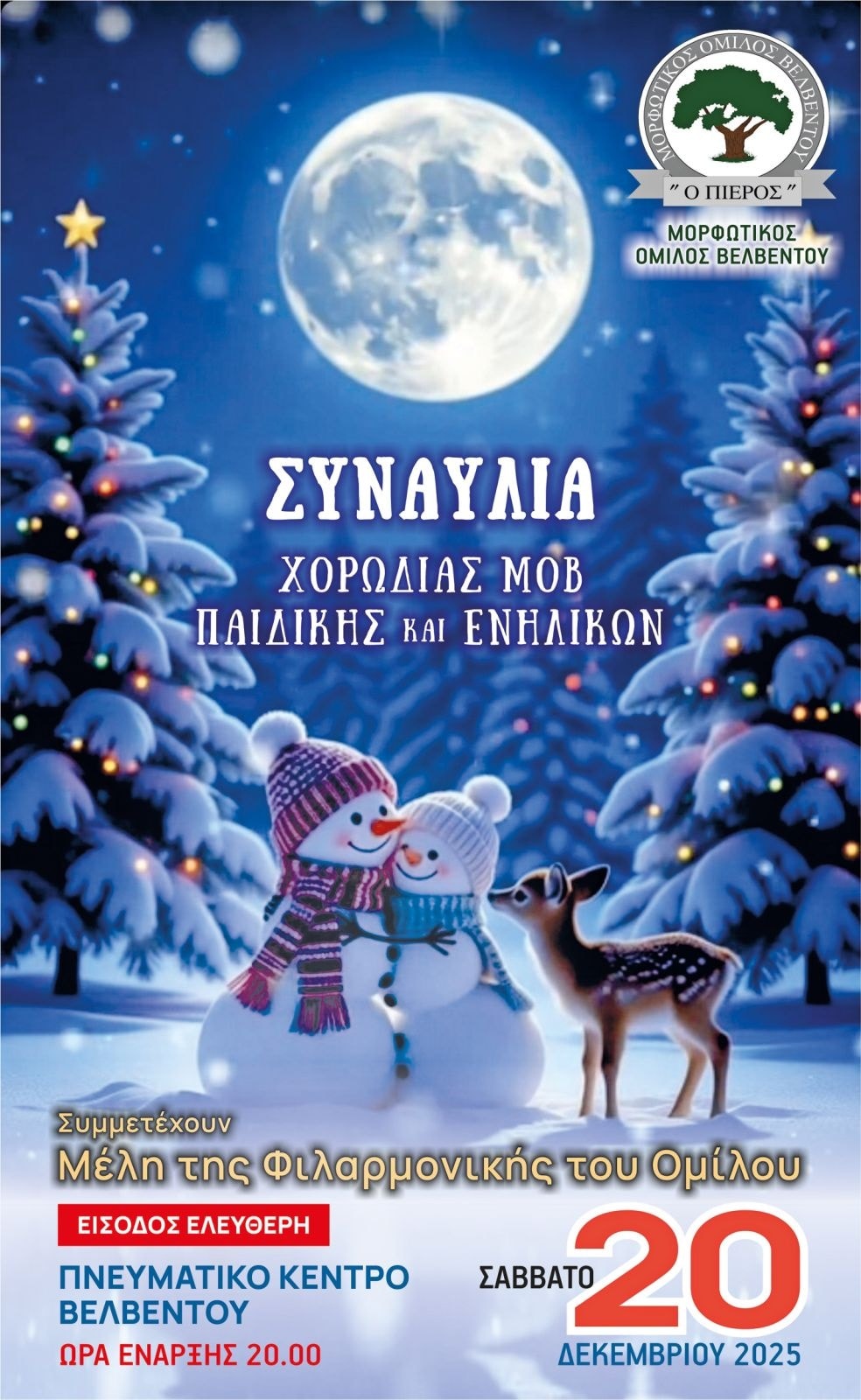 Με το δέντρο πλέον αναμμένο, έρχεται και η στιγμή που η Παιδική Χορωδία και η Χορωδία Ενηλίκων του Μορφωτικού Ομίλου Βελβεντού, θα μας ζεστάνουν με μελωδίες Χριστουγεννιάτικες.
