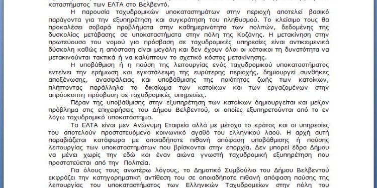 Το Δημοτικό Συμβούλιο Βελβεντού με την 63/31-10-2025 ομόφωνη απόφασή του εκφράζει την έντονη αντίθεση, την ανησυχία και τον προβληματισμό του για την απόφαση της Διοίκησης των Ελληνικών Ταχυδρομείων να προχωρήσει σε παύση της λειτουργίας του υποκαταστήματος των ΕΛΤΑ στο Βελβεντό.