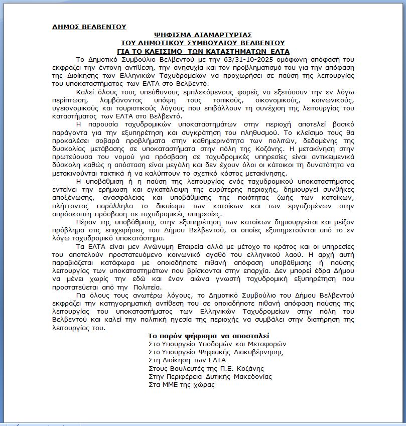 Το Δημοτικό Συμβούλιο Βελβεντού με την 63/31-10-2025 ομόφωνη απόφασή του εκφράζει την έντονη αντίθεση, την ανησυχία και τον προβληματισμό του για την απόφαση της Διοίκησης των Ελληνικών Ταχυδρομείων να προχωρήσει σε παύση της λειτουργίας του υποκαταστήματος των ΕΛΤΑ στο Βελβεντό.