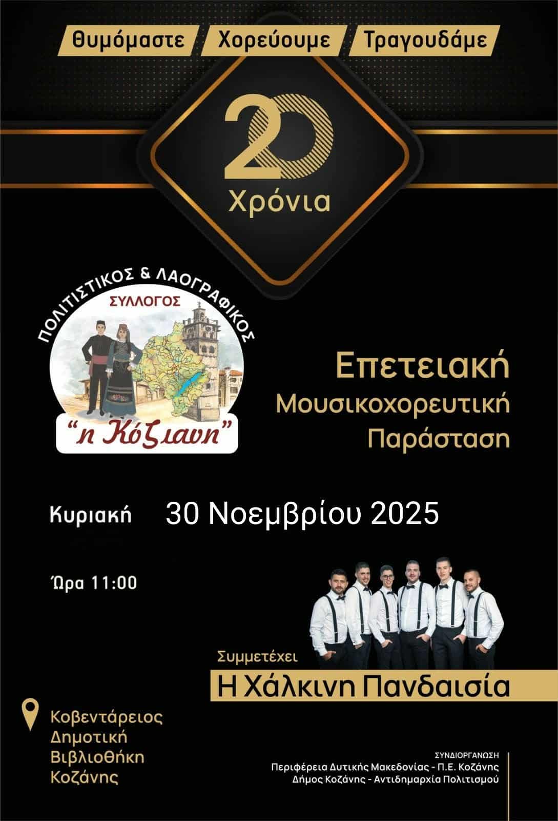 Με αφορμή τη σημαντική αυτή επέτειο, διοργανώνει μια επετειακή μουσικοχορευτική παράσταση γεμάτη μνήμες, συγκίνηση και αυθεντικούς ρυθμούς της Κοζάνης.