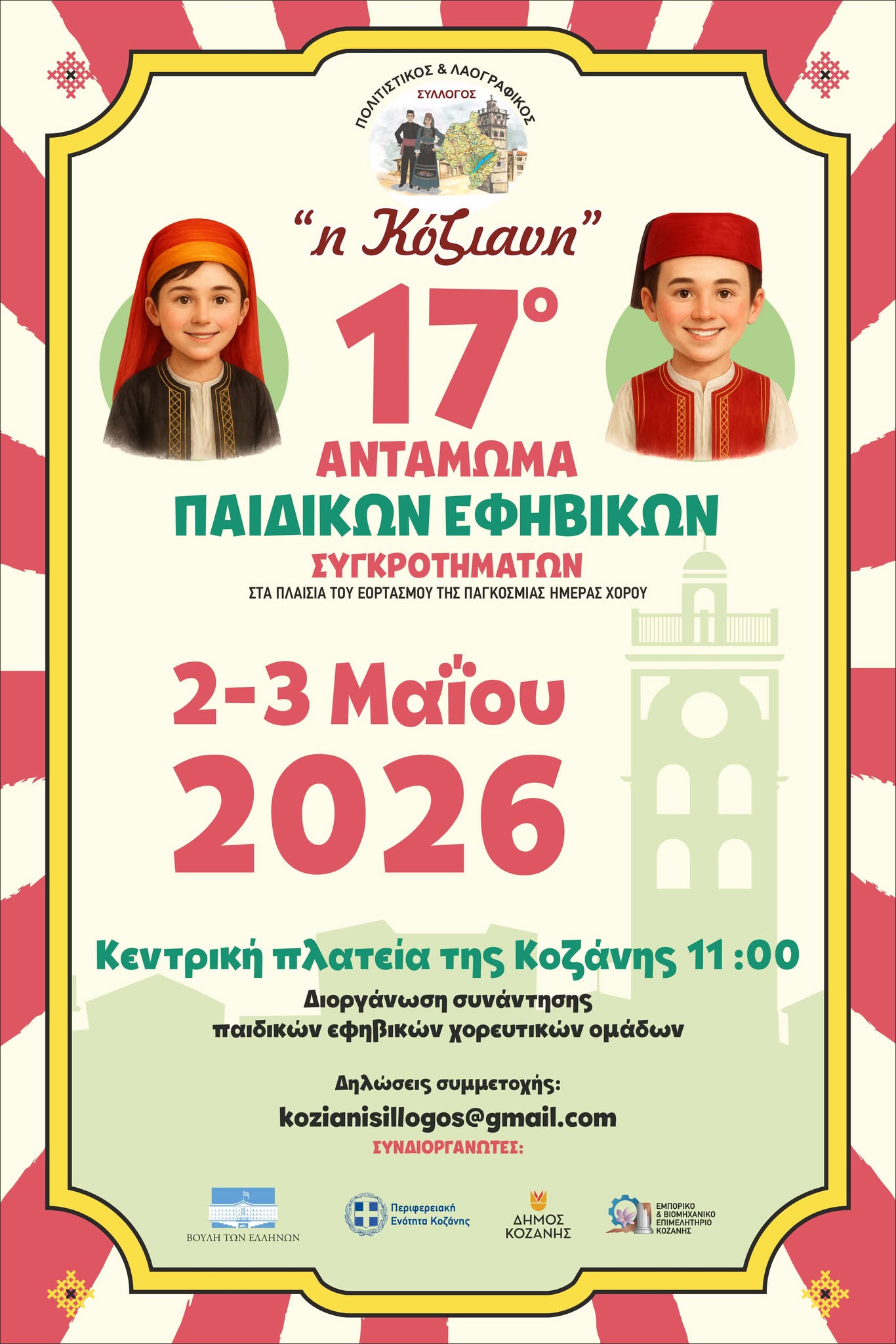 Το 17ο Αντάμωμα Παιδικών & Εφηβικών Χορευτικών Συγκροτημάτων τελεί υπό τη διοργάνωση του Πολιτιστικού & Λαογραφικού Συλλόγου Κοζάνης «Η Κόζιανη» και υλοποιείται με τη συνδιοργάνωση και υποστήριξη της Βουλής των Ελλήνων, της Περιφερειακής Ενότητας Κοζάνης, του Δήμου Κοζάνης και του Εμπορικού & Βιομηχανικού Επιμελητηρίου Κοζάνης.