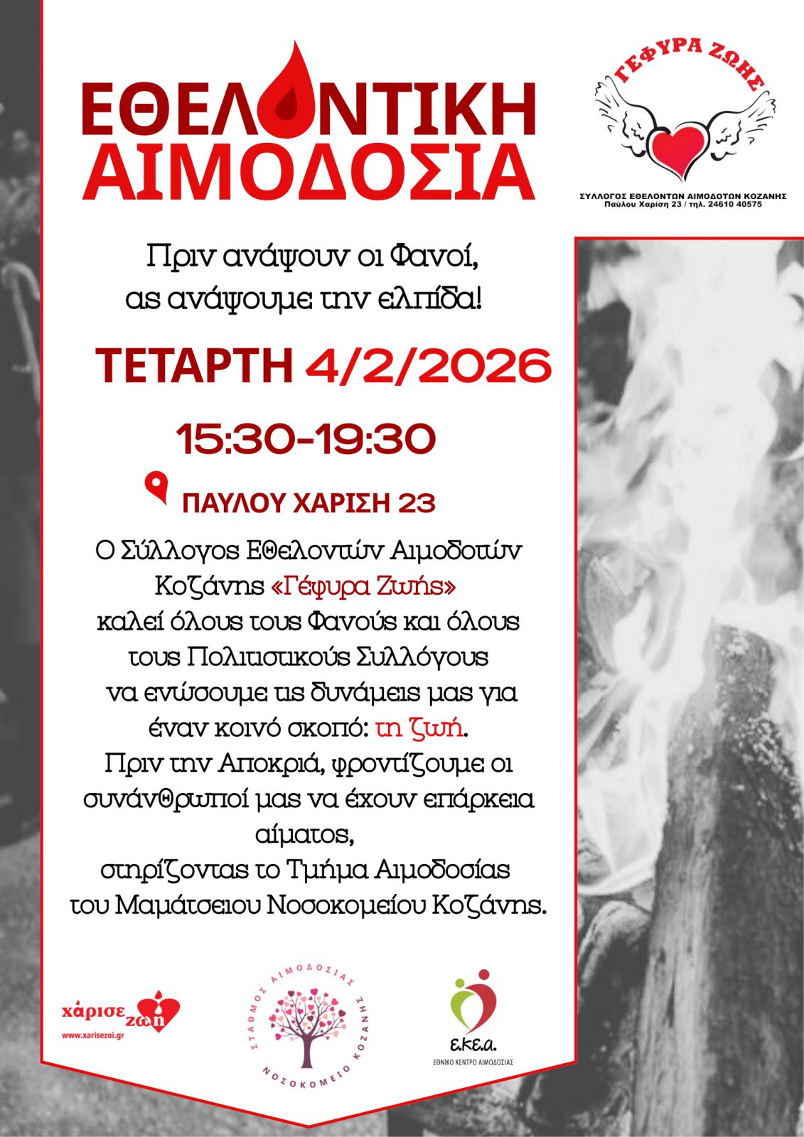 Ο Σύλλογος Εθελοντών Αιμοδοτών Κοζάνης «Γέφυρα Ζωής» απευθύνει ανοιχτό κάλεσμα προς όλους τους Φανούς και τους Πολιτιστικούς Συλλόγους της περιοχής, με στόχο την ενίσχυση της εθελοντικής αιμοδοσίας και την κάλυψη των αυξημένων αναγκών σε αίμα.