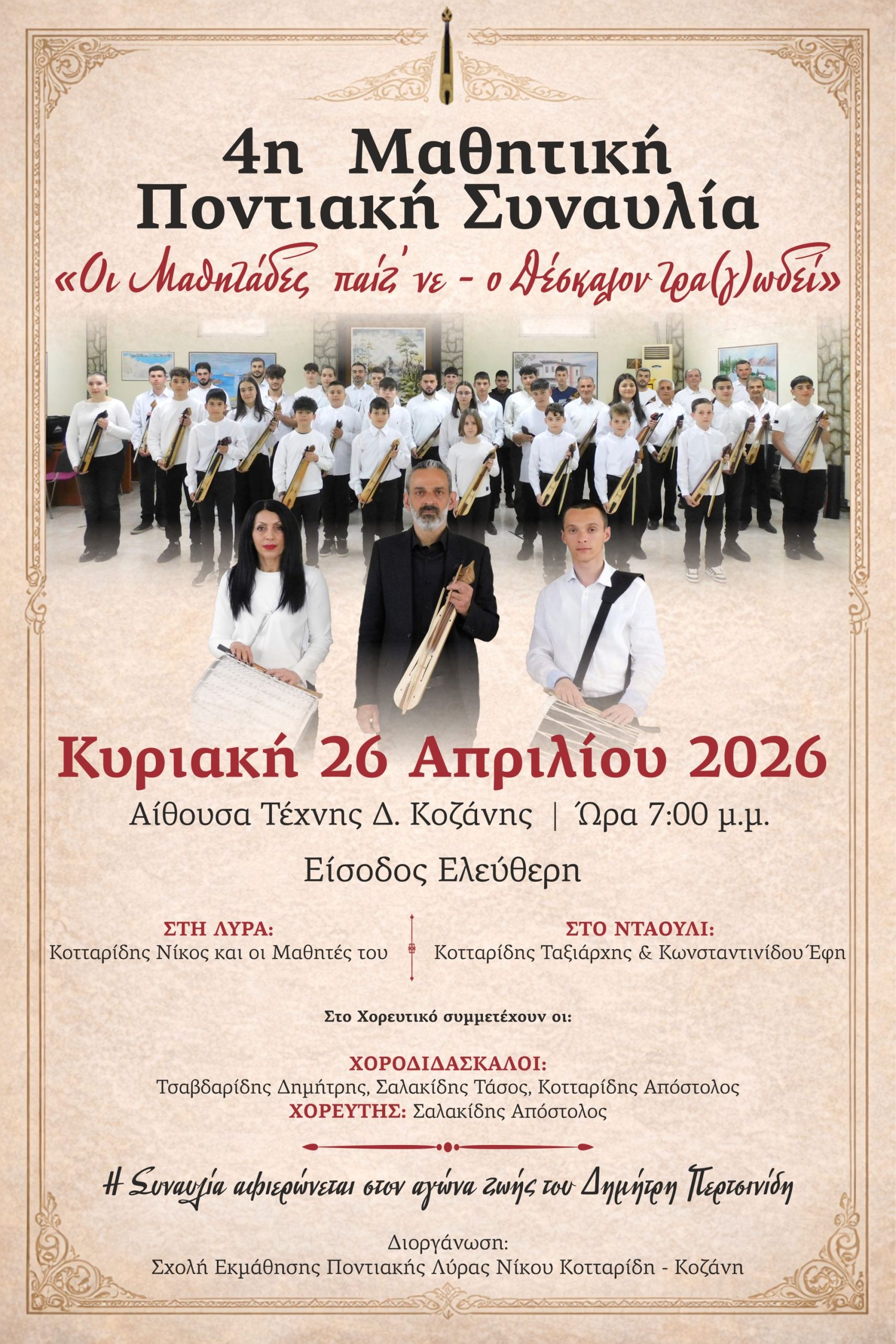Στην 4η Μαθητική Ποντιακή Συναυλία με τίτλο «Οι Μαθητάδες παίζ΄νε – ο Δέσκαλον τρα(γ)ωδεί», σας προσκαλούν ο Νίκος Κοτταρίδης και οι μαθητές του, από την Σχολή Εκμάθησης Ποντιακής Λύρας στην Κοζάνη, την Κυριακή 26 Απριλίου 2026 και ώρα 7:00 μ.μ. στην Αίθουσα Τέχνης Κοζάνης, με ελεύθερη είσοδο για το κοινό.