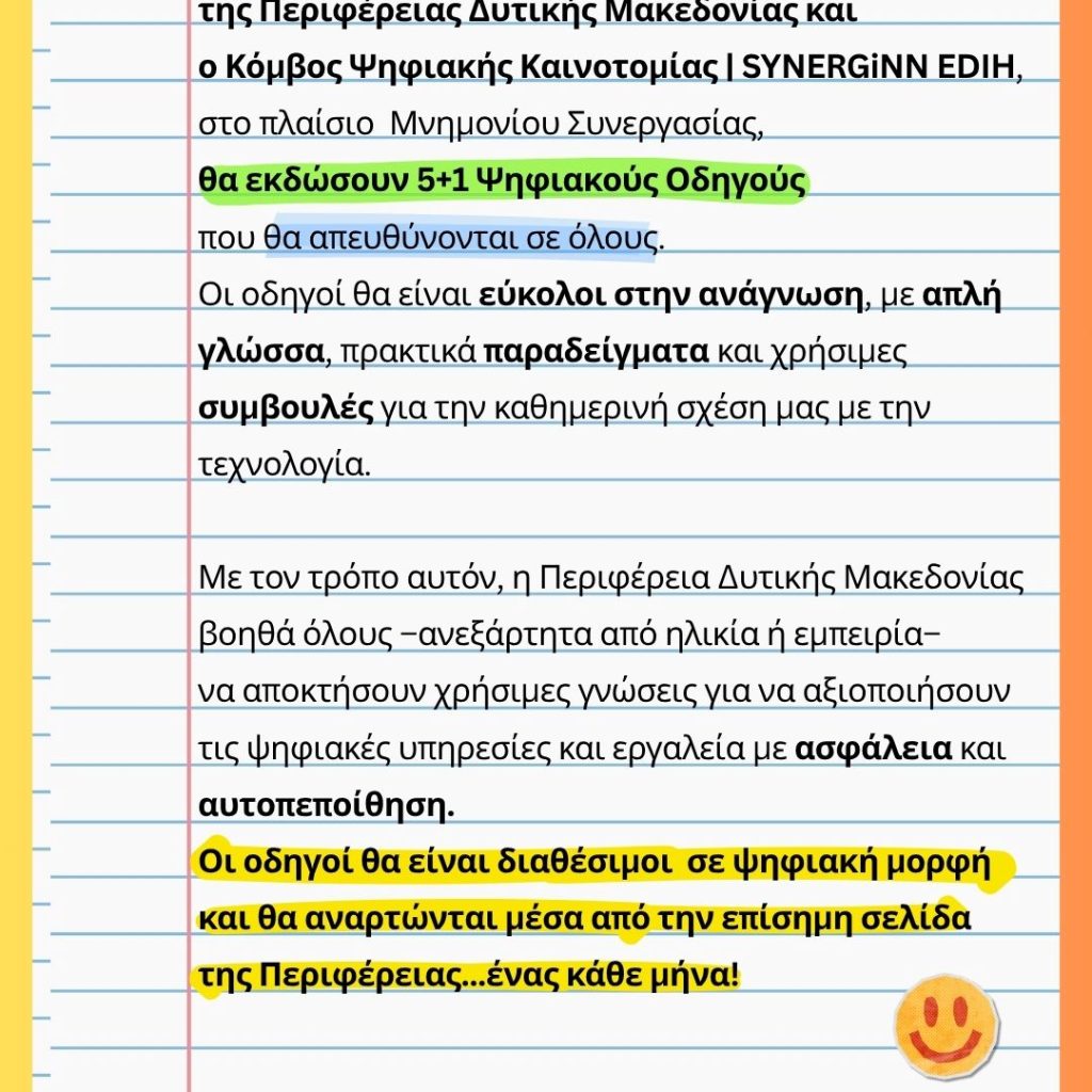Η Αντιπεριφέρεια Διαφάνειας, Ηλεκτρονικής Διακυβέρνησης & Ψηφιακού Μετασχηματισμού της Περιφέρειας Δυτικής Μακεδονίας και ο Κόμβος Ψηφιακής Καινοτομίας | SYNERGiNNEDIH, στο πλαίσιο Μνημονίου Συνεργασίας, θα εκδώσουν 5+1 Ψηφιακούς Οδηγούς που θα απευθύνονται σε όλους.
