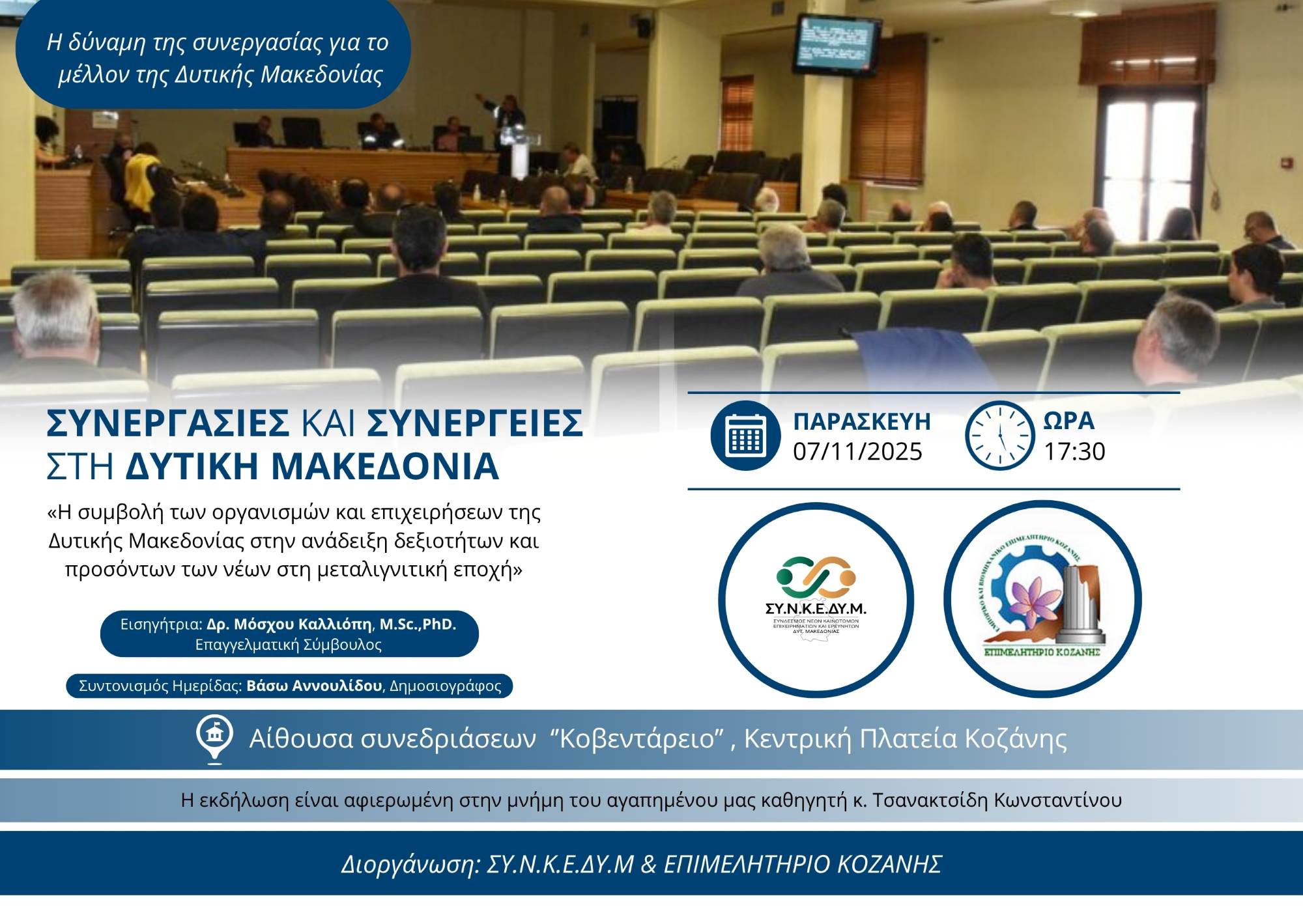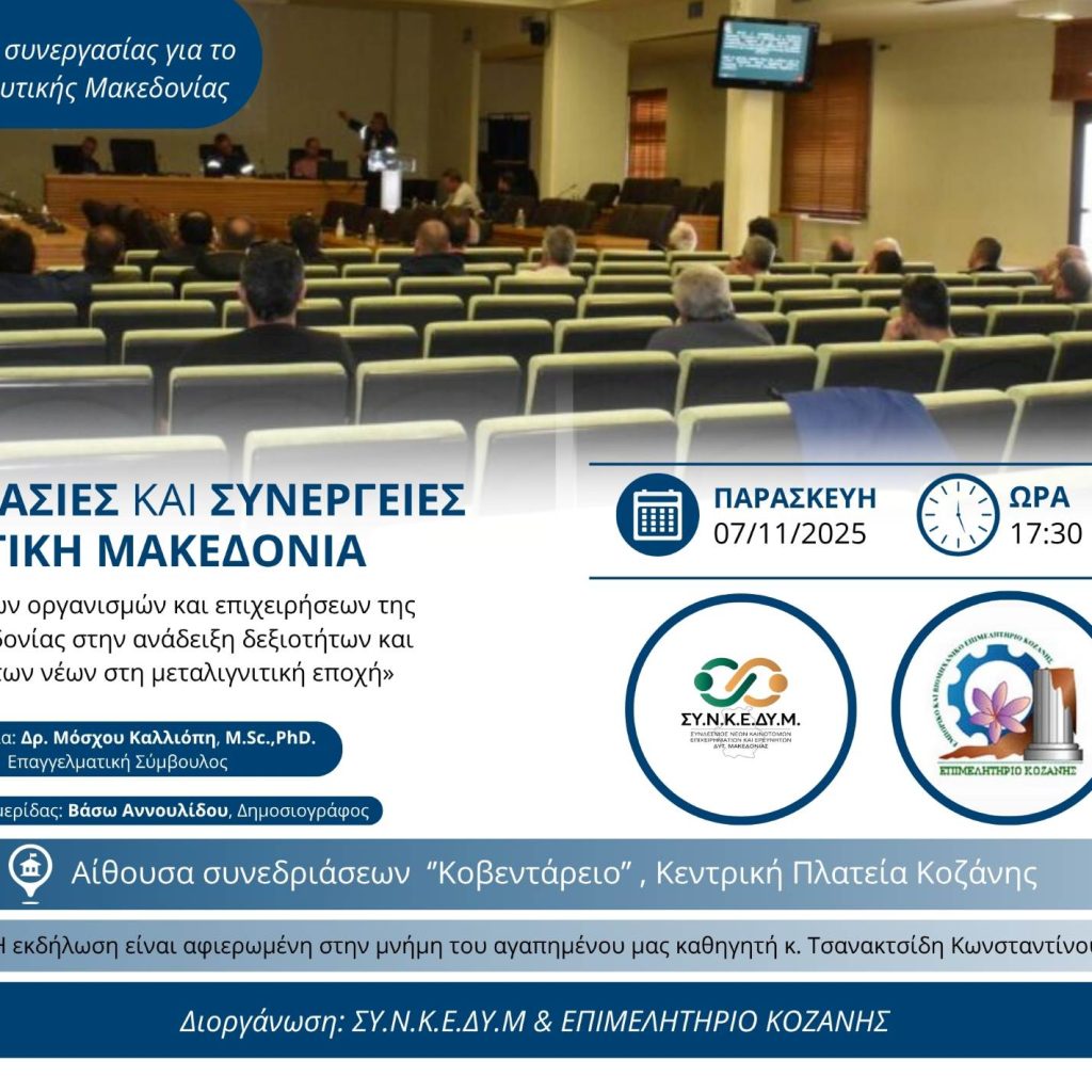 Ο Σύνδεσμος Νέων Καινοτόμων Επιχειρηματιών και Ερευνητών Δυτικής Μακεδονίας (ΣΥ.Ν.Κ.Ε.ΔΥ.Μ.) σε συνεργασία με το Επιμελητήριο Κοζάνης σας προσκαλούν στην ημερίδα με θέμα: