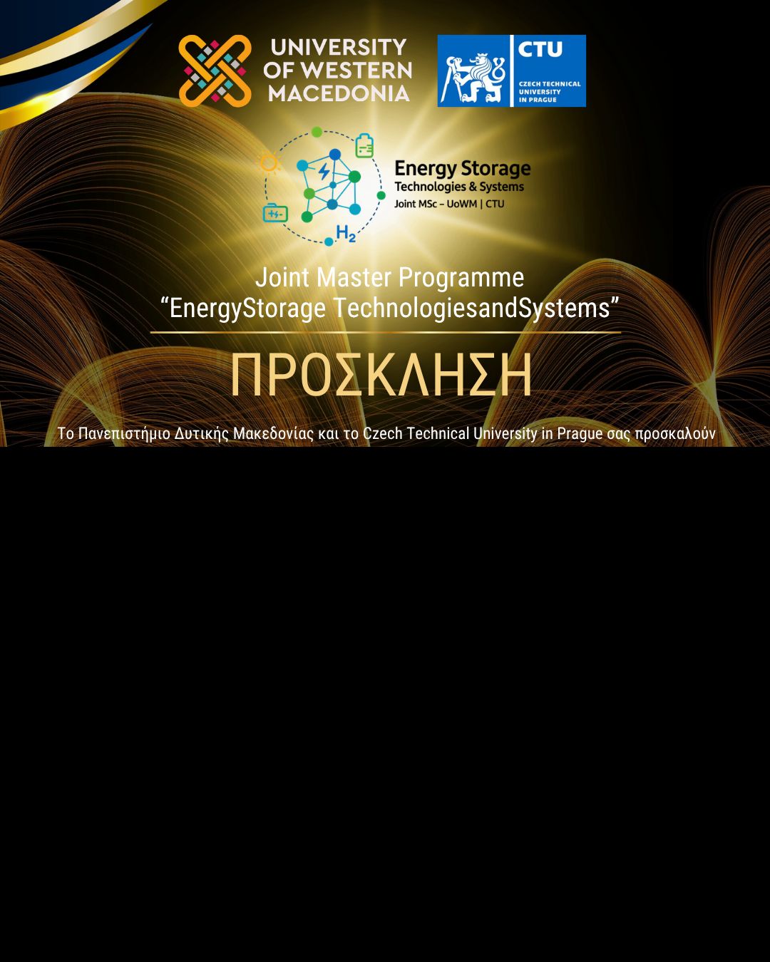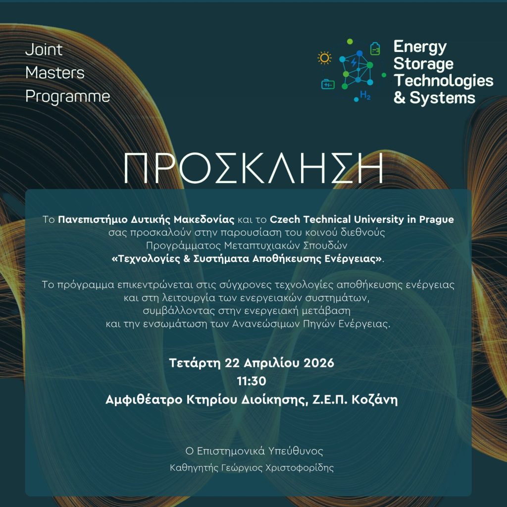 Παρουσιάζεται την Τετάρτη 22 Απριλίου 2026 και ώρα 11:30, στο Αμφιθέατρο του Κτιηρίου Διοίκησης του Πανεπιστημίου Δυτικής Μακεδονίας στη ΖΕΠ Κοζάνης, το νέο Κοινό Διεθνές Πρόγραμμα Μεταπτυχιακών Σπουδών «Τεχνολογίες και Συστήματα Αποθήκευσης Ενέργειας» (Energy Storage Technologies and Systems), το οποίο υλοποιείται από το Πανεπιστήμιο Δυτικής Μακεδονίας σε συνεργασία με το Τεχνολογικό Πανεπιστήμιο της Πράγας.