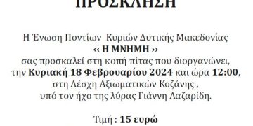 Read moreDetailsΚοπή πίτας της Ένωσης Ποντίων Κυριών Δυτικής Μακεδονίας '' η ΜΝΗΜΗ'' που θα πραγματοποιηθεί στις 18 Φεβρουαρίου 2024, ώρα 12:00...