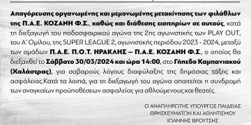 Read moreDetailsΗ Διοίκηση του Γ.Ν. Κοζάνης ενημερώνει τους πολίτες ότι, από το πρωί της Δευτέρας 1-4-2024 και έως την ολοκλήρωση των...