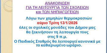 Read moreDetailsΛόγω των χαμηλών θερμοκρασιών που επικρατούν στην περιοχή, την Τρίτη 13 Ιανουαρίου 2025, με απόφαση του Δημάρχου Γιώργου Στεργίου, τα μαθήματα θα ξεκινήσουν μία ώρα αργότερα σε όλα τα σχολεία...
