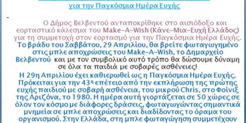 Read moreDetailsΟ Δήμος Βελβεντού ανταποκρίθηκε στο αισιόδοξο και εορταστικό κάλεσμα του Make-A-Wish (Κάνε-Μια-Ευχή Ελλάδος) για τη συμμετοχή στον εορτασμό για την Παγκόσμια Ημέρα Ευχής. Το βράδυ του Σαββάτου, 29 Απριλίου, θα βρείτε φωταγωγημένο στις...