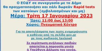 Read moreDetailsΟ ΕΟΔΥ σε συνεργασία με το Δήμο θα πραγματοποιήσει και πάλι δωρεάν Rapid tests των κατοίκων (εμβολιασμένων και μη) Μέρα: Τρίτη 17 Ιανουαρίου 2023 Ώρες: 11:00 έως 13:00 Χώρος: Πνευματικό...