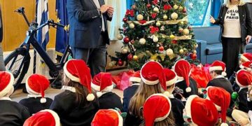 Γιορτινή ατμόσφαιρα δημιούργησαν σήμερα, Παρασκευή 23 Δεκεμβρίου 2022, στο Υπουργείο Υποδομών και Μεταφορών, μαθητές της Β΄ Δημοτικού από τα Αρσάκεια Εκπαιδευτήρια Ψυχικού, που έψαλλαν τα Κάλαντα των Χριστουγέννων στον Υφυπουργό...