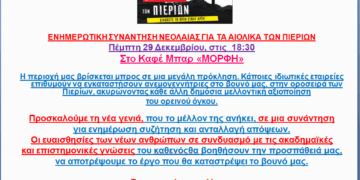 Read moreDetailsΠέμπτη 29 Δεκεμβρίου, στις 18:30 Στο Καφέ Μπαρ «ΜΟΡΦΗ» Η περιοχή μας βρίσκεται μπρος σε μια μεγάλη πρόκληση. Κάποιες ιδιωτικές εταιρείες επιθυμούν να εγκαταστήσουν ανεμογεννήτριες στο βουνό μας, στην οροσειρά...