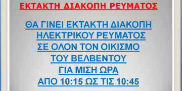 Read moreDetailsΘΑ ΓΙΝΕΙ ΕΚΤΑΚΤΗ ΔΙΑΚΟΠΗ ΗΛΕΚΤΡΙΚΟΥ ΡΕΥΜΑΤΟΣ ΣΕ ΟΛΟΝ ΤΟΝ ΟΙΚΙΣΜΟ ΤΟΥ ΒΕΛΒΕΝΤΟΥ ΓΙΑ ΜΙΣΗ ΩΡΑ ΑΠΟ 10:15 ΩΣ ΤΙΣ 10:45 ΣΑΒΒΑΤΟ 10 ΔΕΚΕΜΒΡΙΟΥ 2022