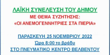 Read moreDetailsΔΗΜΟΣ ΒΕΛΒΕΝΤΟΥ - ΛΑΪΚΗ ΣΥΝΕΛΕΥΣΗ ΤΟΥ ΔΗΜΟΥ ΜΕ ΘΕΜΑ ΣΥΖΗΤΗΣΗΣ: «ΟΙ ΑΝΕΜΟΓΕΝΝΗΤΡΙΕΣ ΣΤΑ ΠΙΕΡΙΑ» ΠΑΡΑΣΚΕΥΗ 25 ΝΟΕΜΒΡΙΟΥ 2022 Ώρα 8:00 το βράδυ ΣΤΟ ΠΝΕΥΜΑΤΙΚΟ ΚΕΝΤΡΟ ΒΕΛΒΕΝΤΟΥ