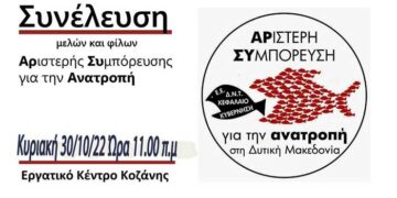 Read moreDetailsΚαλούμε όλα τα μέλη και τους φίλους να παραβρεθούν στη Γενική Συνέλευση του Περιφερειακού Σχήματος «Αριστερή Συμπόρευση για την ΑΝΑΤΡΟΠΗ στη Δυτική Μακεδονία», την Κυριακή 30/10/2022 και ώρα 11.00 π.μ....